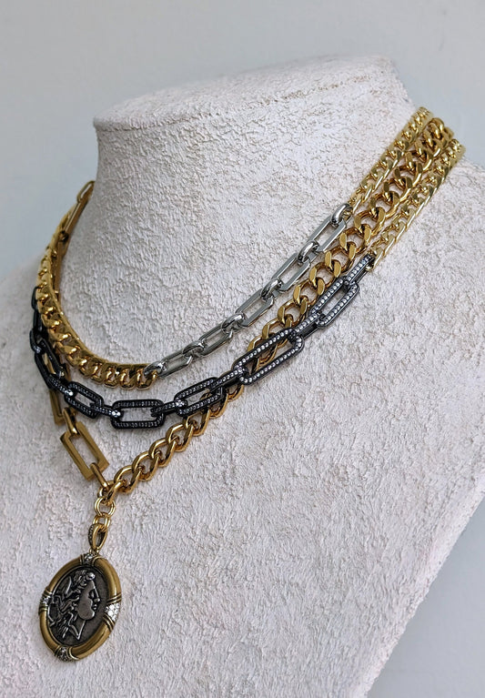 Chunky multi layer gold necklace for women, two tone ancient medallion necklace, pave black diamond choker, thick gold chain layered jewelry