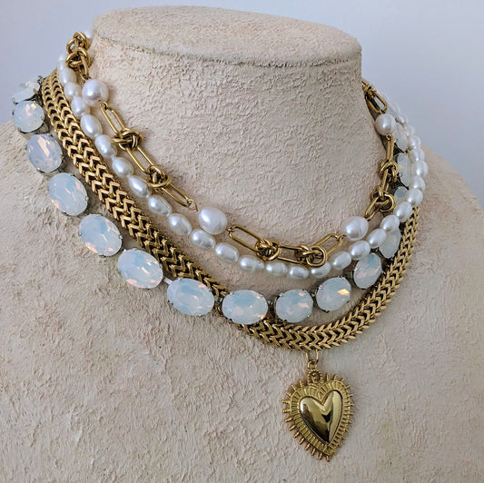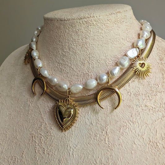 Boho baroque pearl necklace with Sacred Heart pendant, gold crescent moon charm necklace set, gold and pearl statement choker, bold jewelry