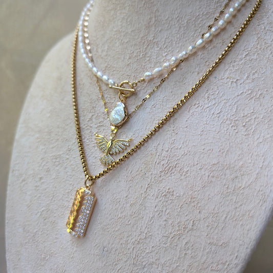 Boho freshwater pearl and gold pendant necklace stacked set, diamond phoenix pendant necklace, razorblade pave pendant, perfect gift for her