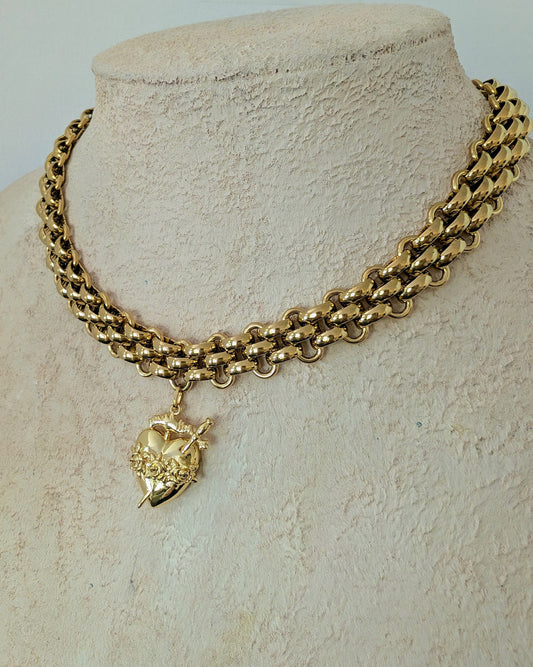 Chunky gold heart and sword necklace, thick chain sacred heart choker, immaculate heart boho statement necklace, Catholic gift for her