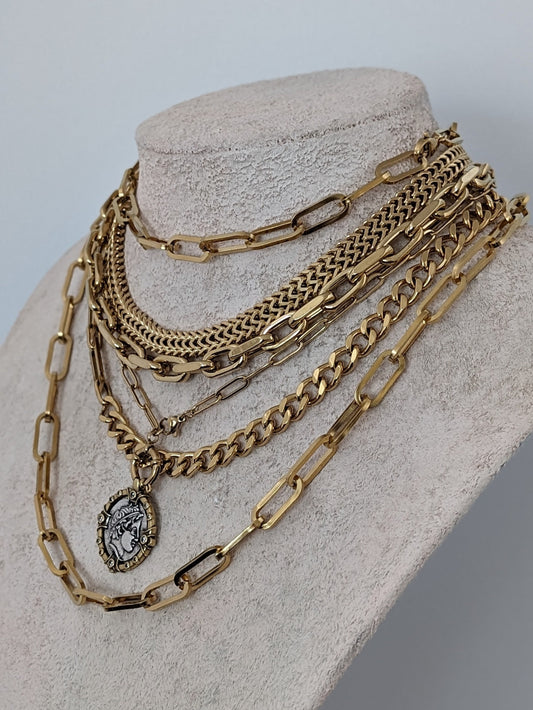 Layered chunky gold chain coin necklace set, ancient medallion paperclip necklace, curb chain diamond choker, multi strand chunky chain set