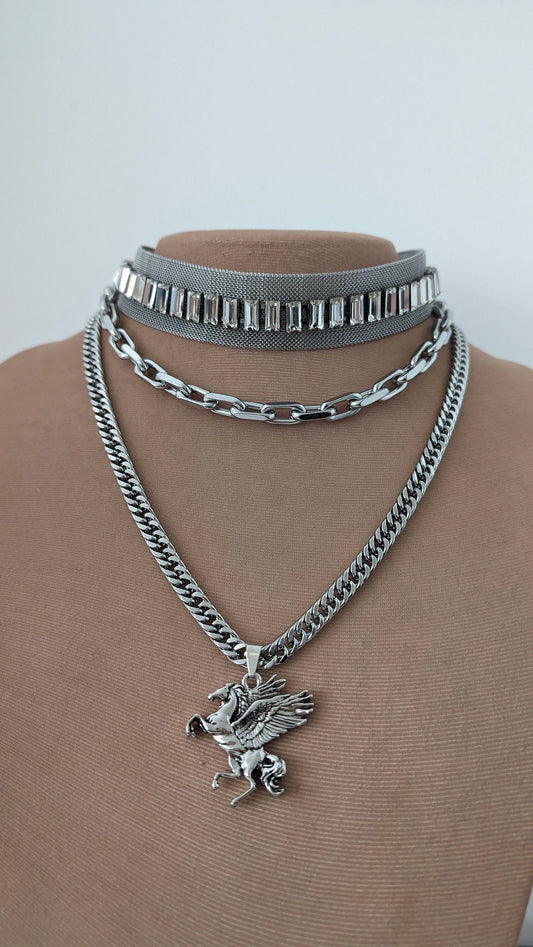 Layered gold chain necklace set, chunky multi layer necklace, ancient medallion pendant, two tone chain necklace, curb chain diamond choker