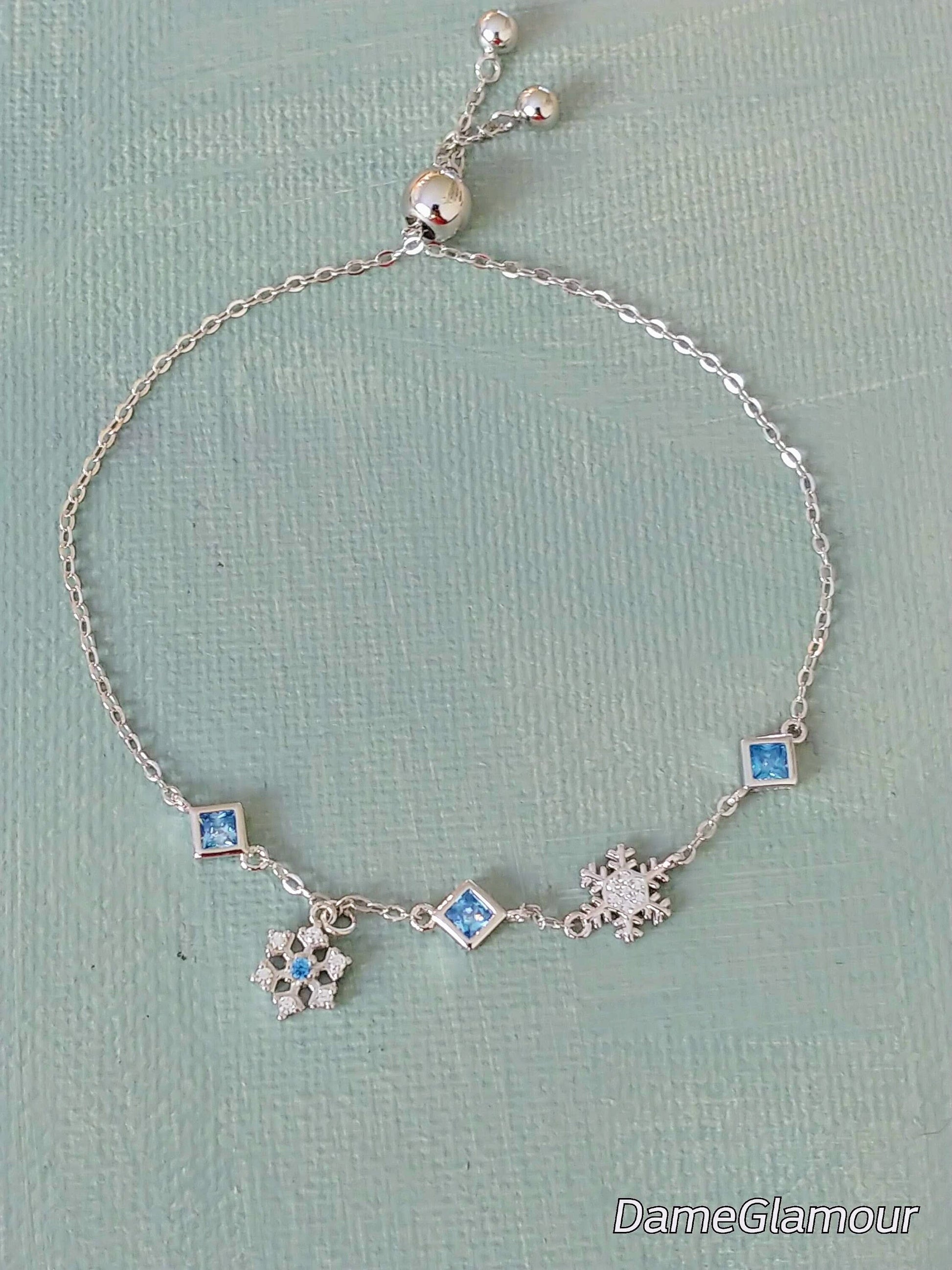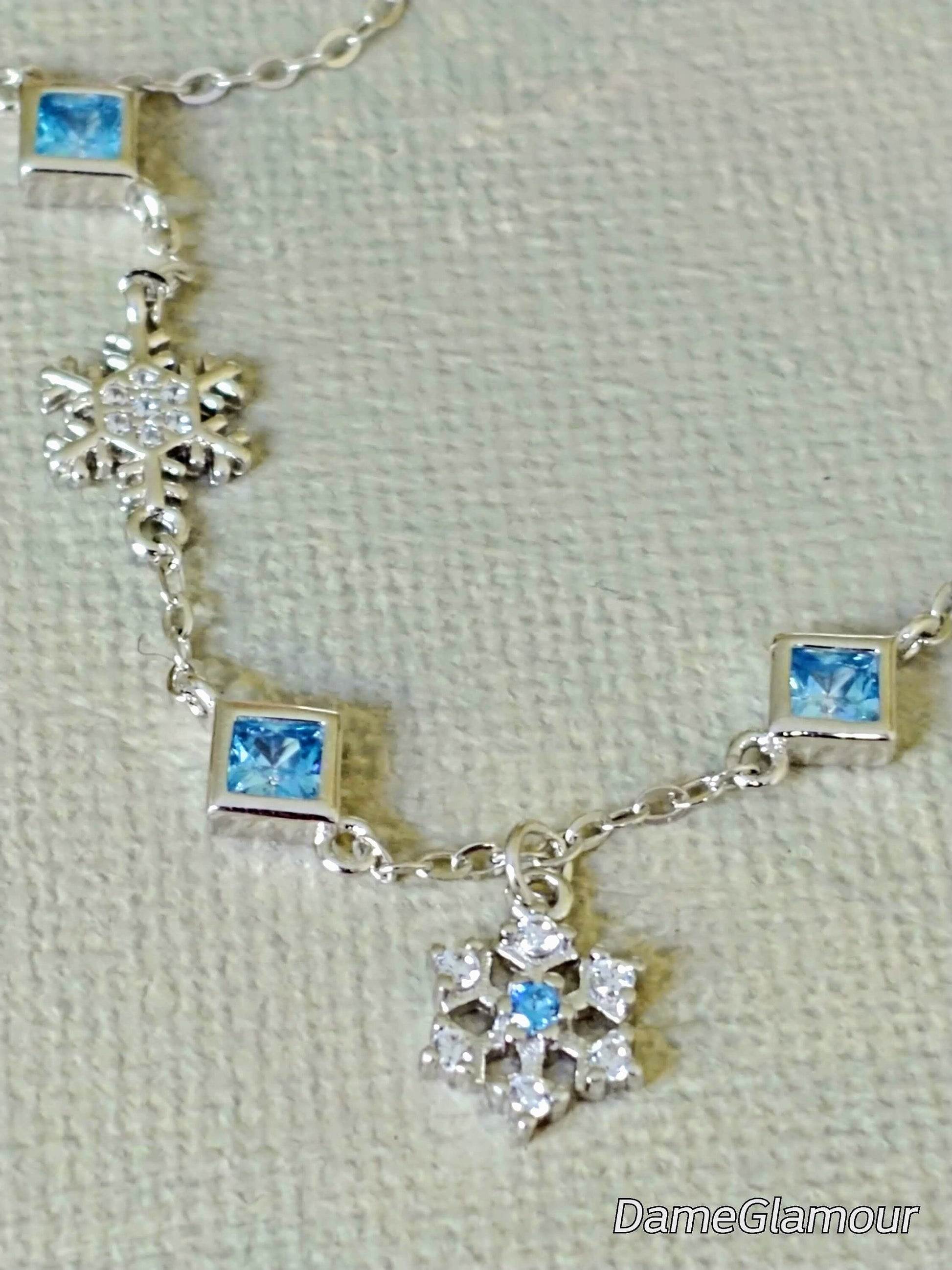 This genuine 925 silver bracelet, ring and earring is very dainty and very cute. Tiny zircon crystals adorn the little snowflakes, and geometric squares hold light blue zircons, reminiscent of water. The ring also has tiny blue zircons, and earrings are embedded with clear zircons, like in the bracelet.