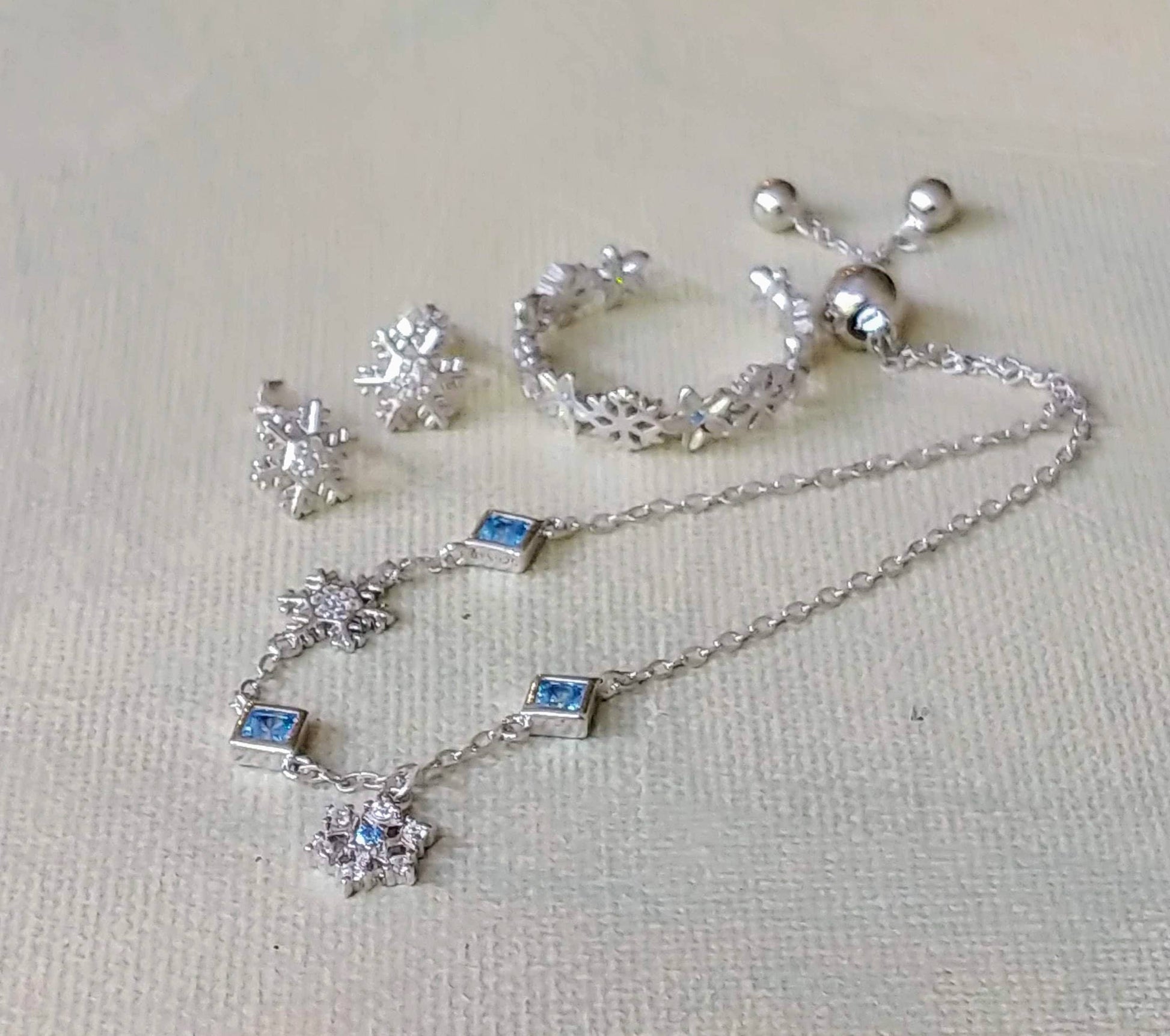925 sterling silver bracelet,dainty bracelet earring set,s925 adjustable ring,snowflake earring,christmas gift idea,gift for her birthday