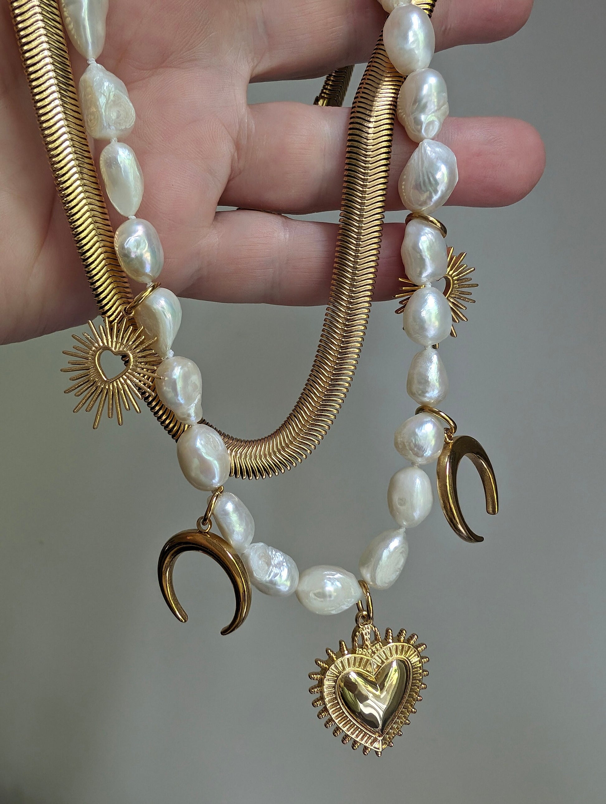 Elevate your style with this exquisite baroque freshwater pearl necklace featuring a sizable sacret heart gold charm at the center. There are downward crescent and spiky heart charms on both side, making this set a bold and very boho chic combination. This timeless piece effortlessly combines elegance of gold chain with a touch of pearl romance, perfect for any occasion. Handcrafted with care, each lustrous pearl is unique, adding a luxurious and sophisticated touch to your look. This necklace is a versatile addition to your jewelry collection, making it a thoughtful gift for yourself or a loved one. Wear it alone for a classic statement or layer it with other pieces for a personalized and chic ensemble.
