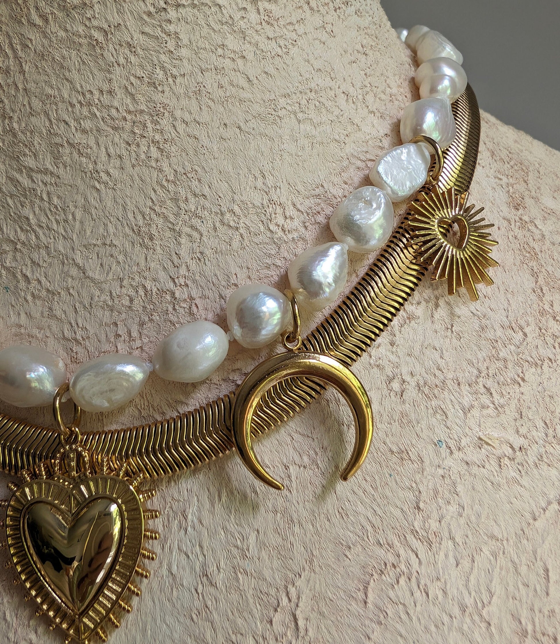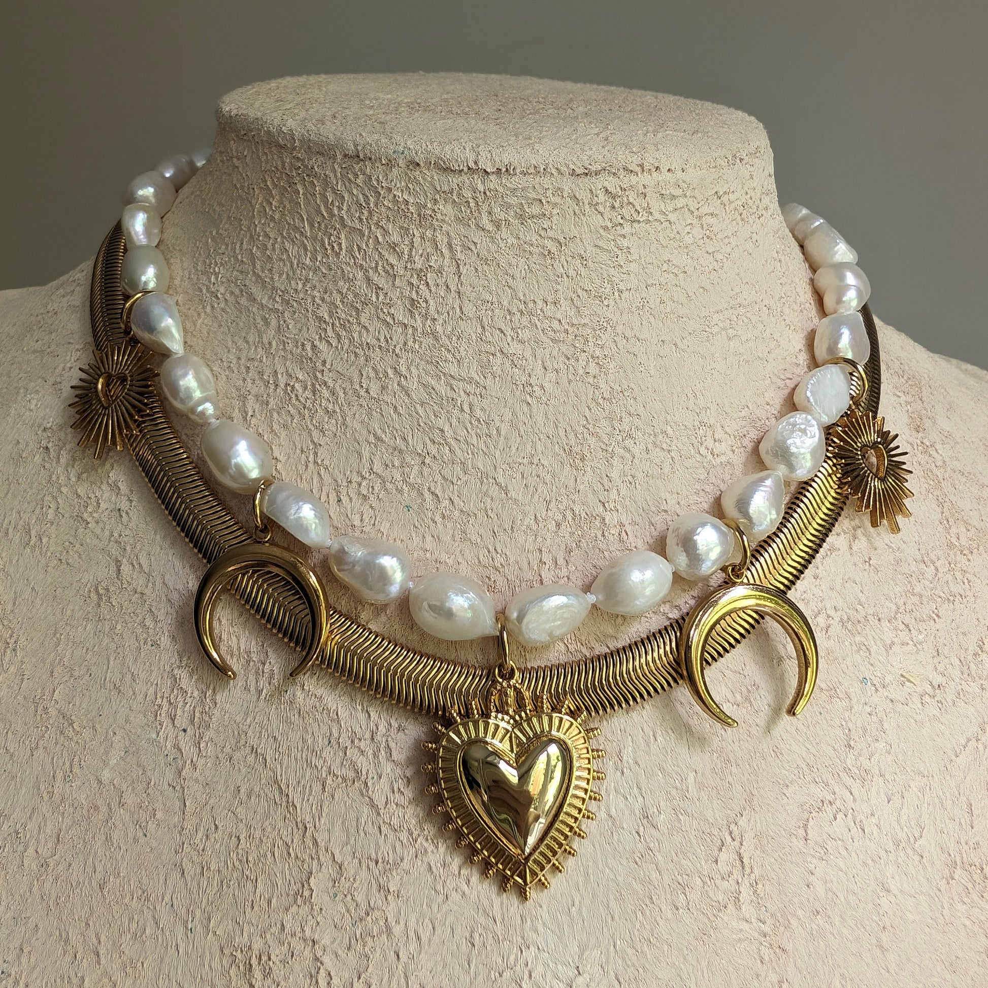 Boho baroque pearl necklace with Sacred Heart pendant, gold crescent moon charm necklace set, gold and pearl statement choker, bold jewelry