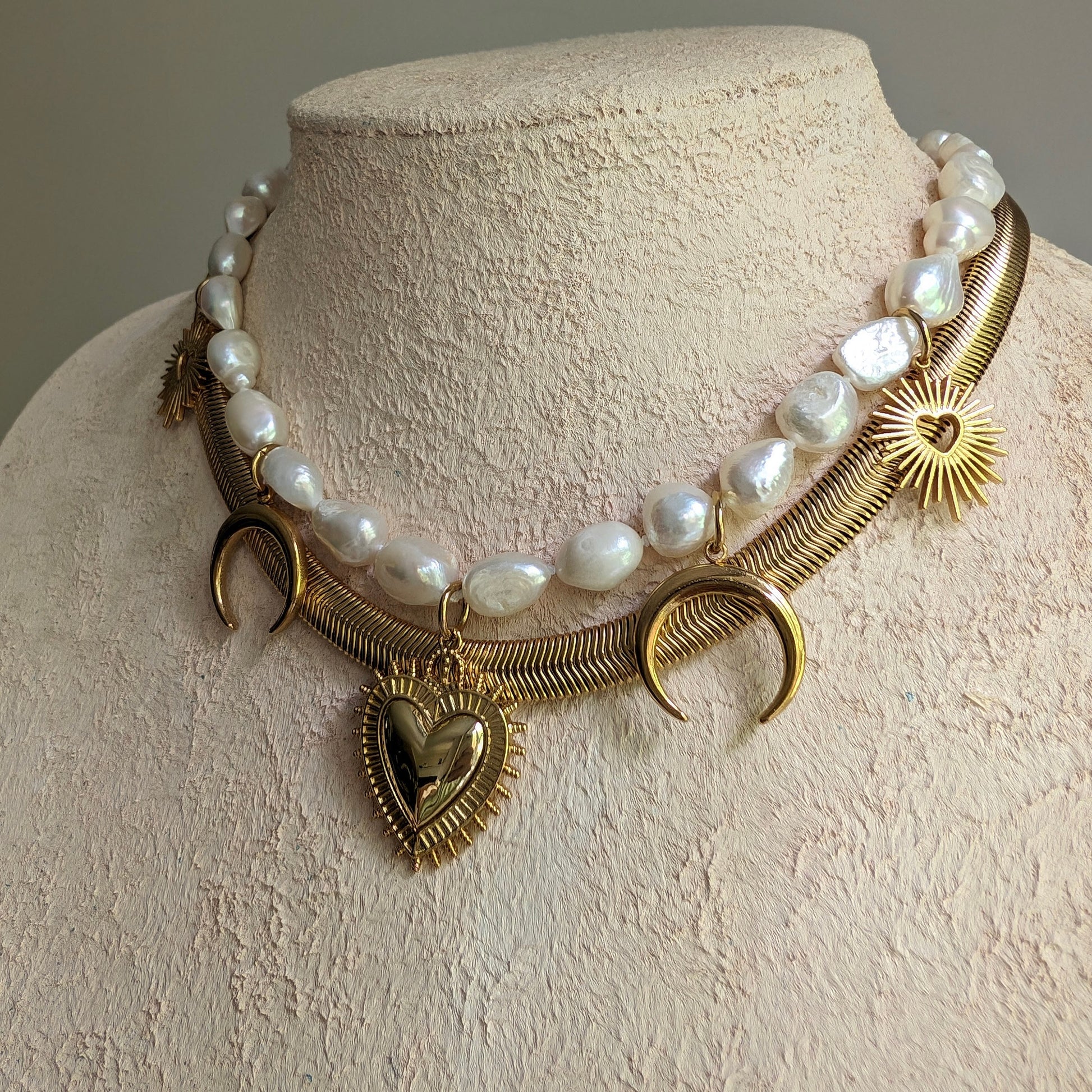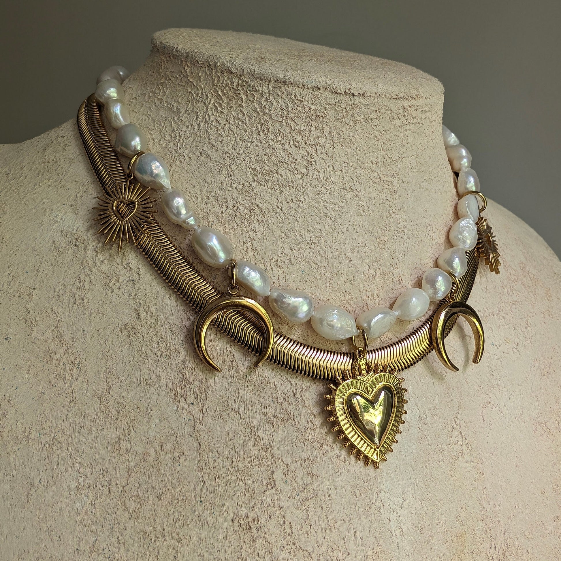 oho baroque pearl necklace with Sacred Heart pendant, gold crescent moon charm necklace set, gold and pearl statement choker, bold jewelry