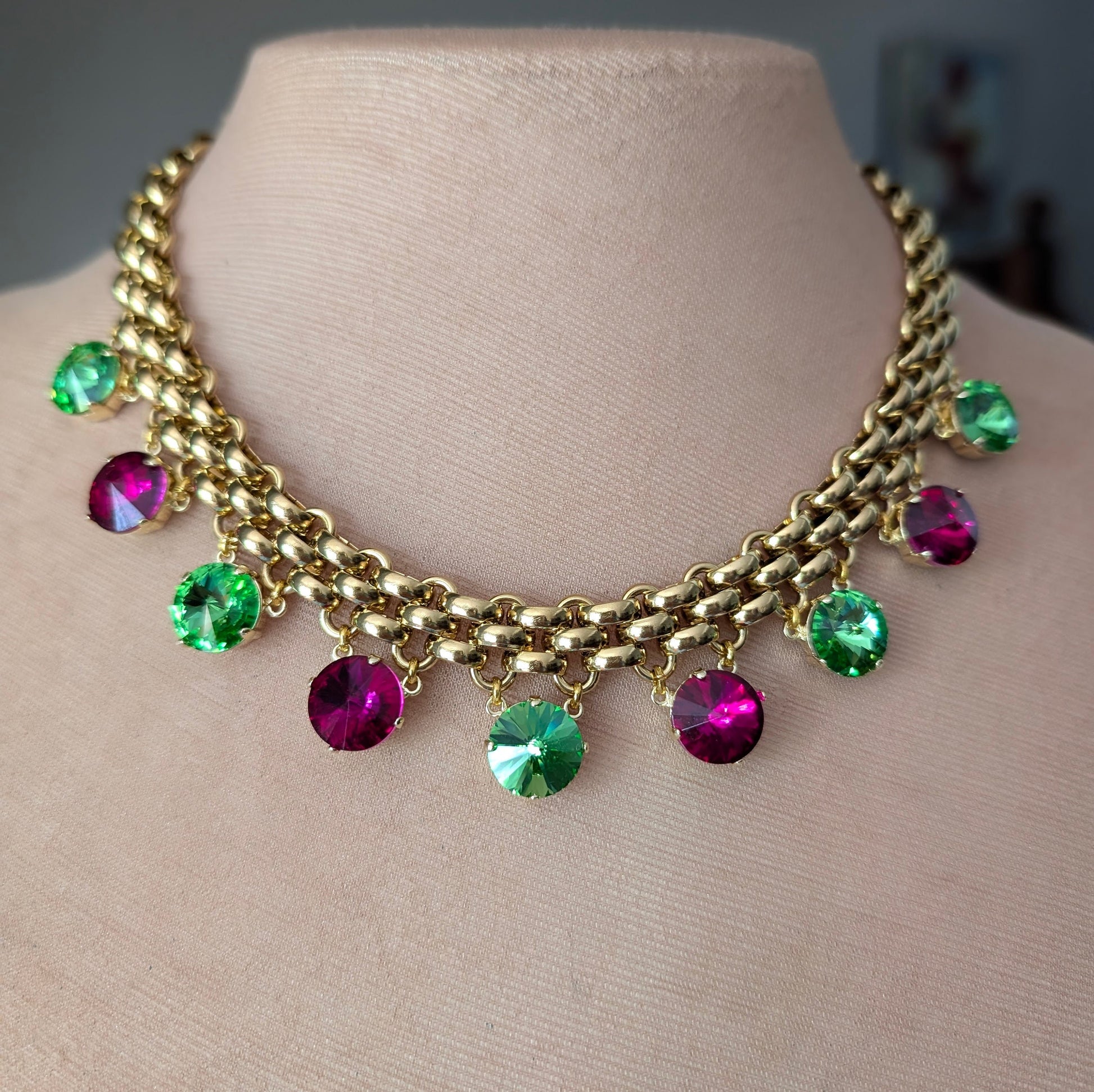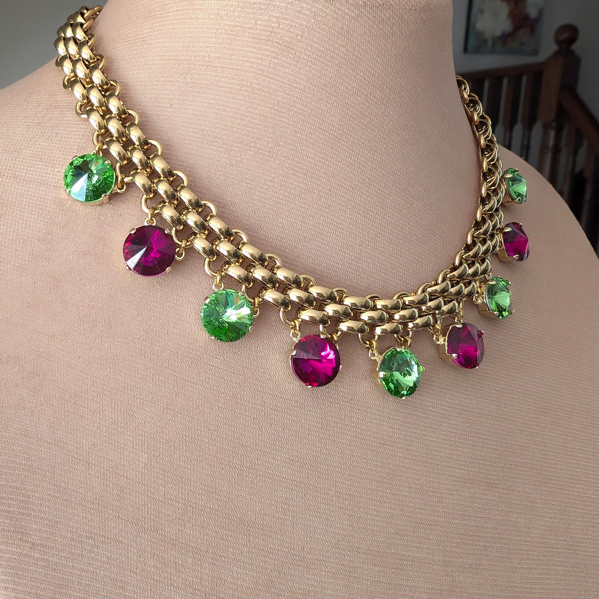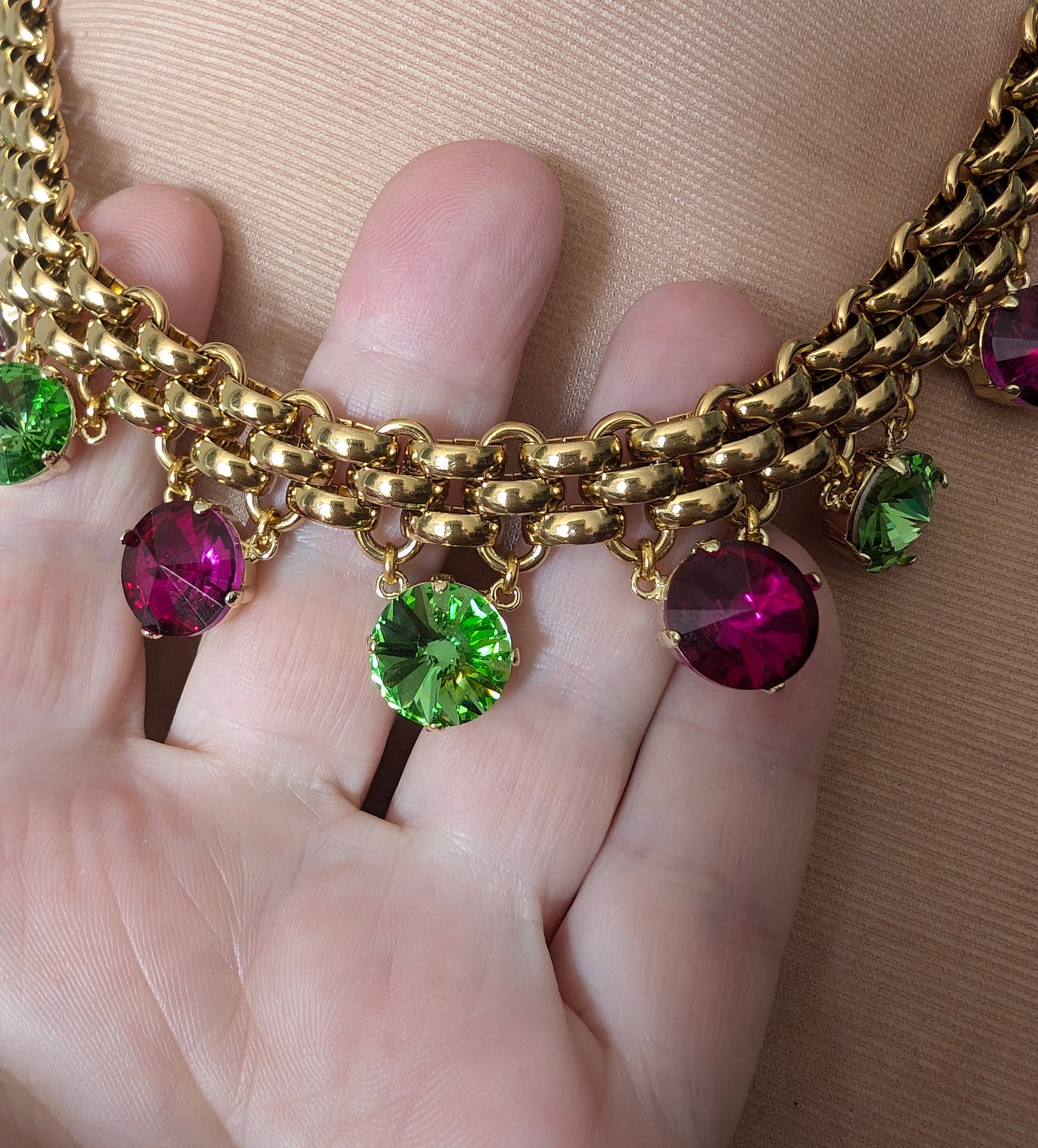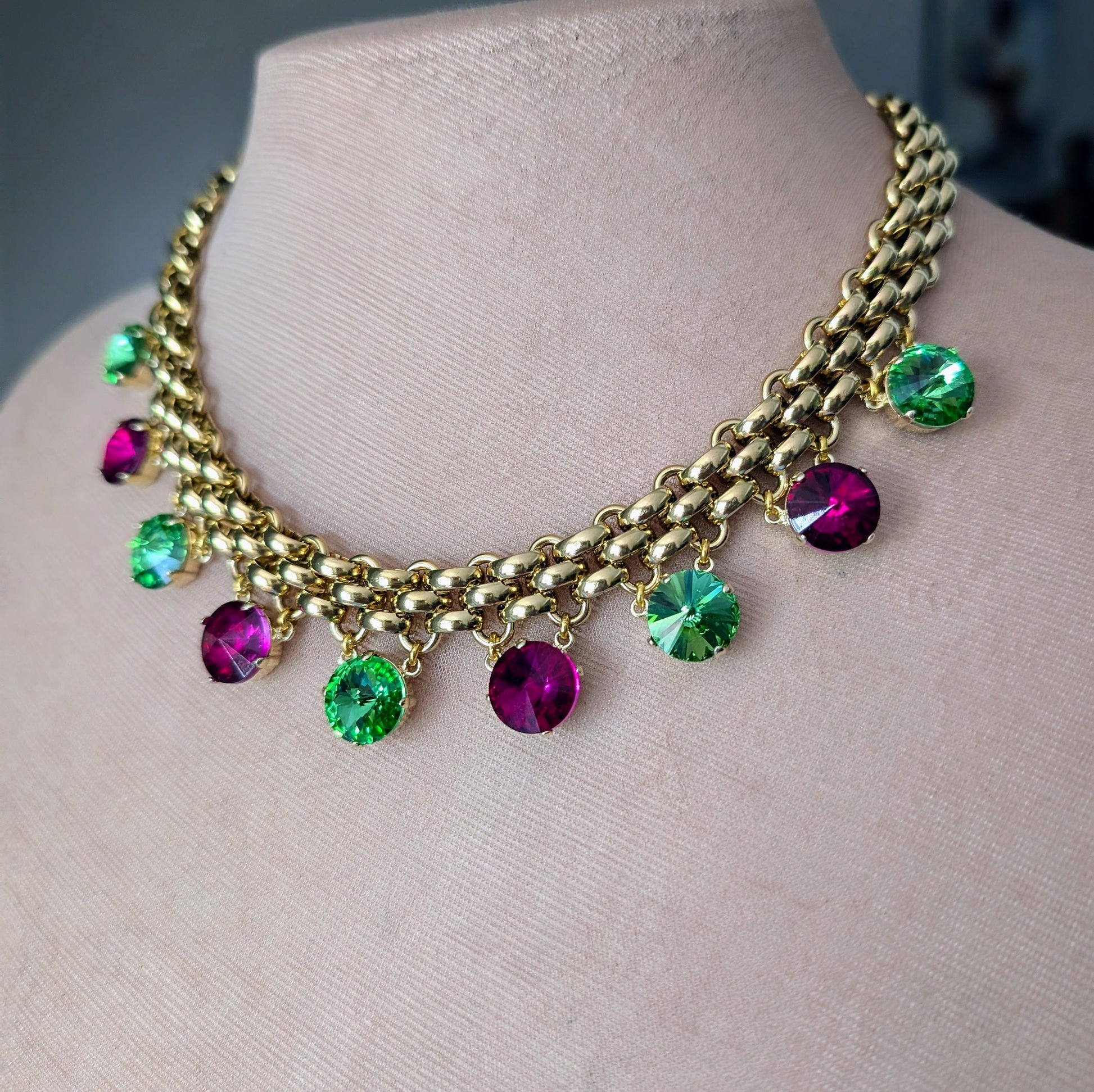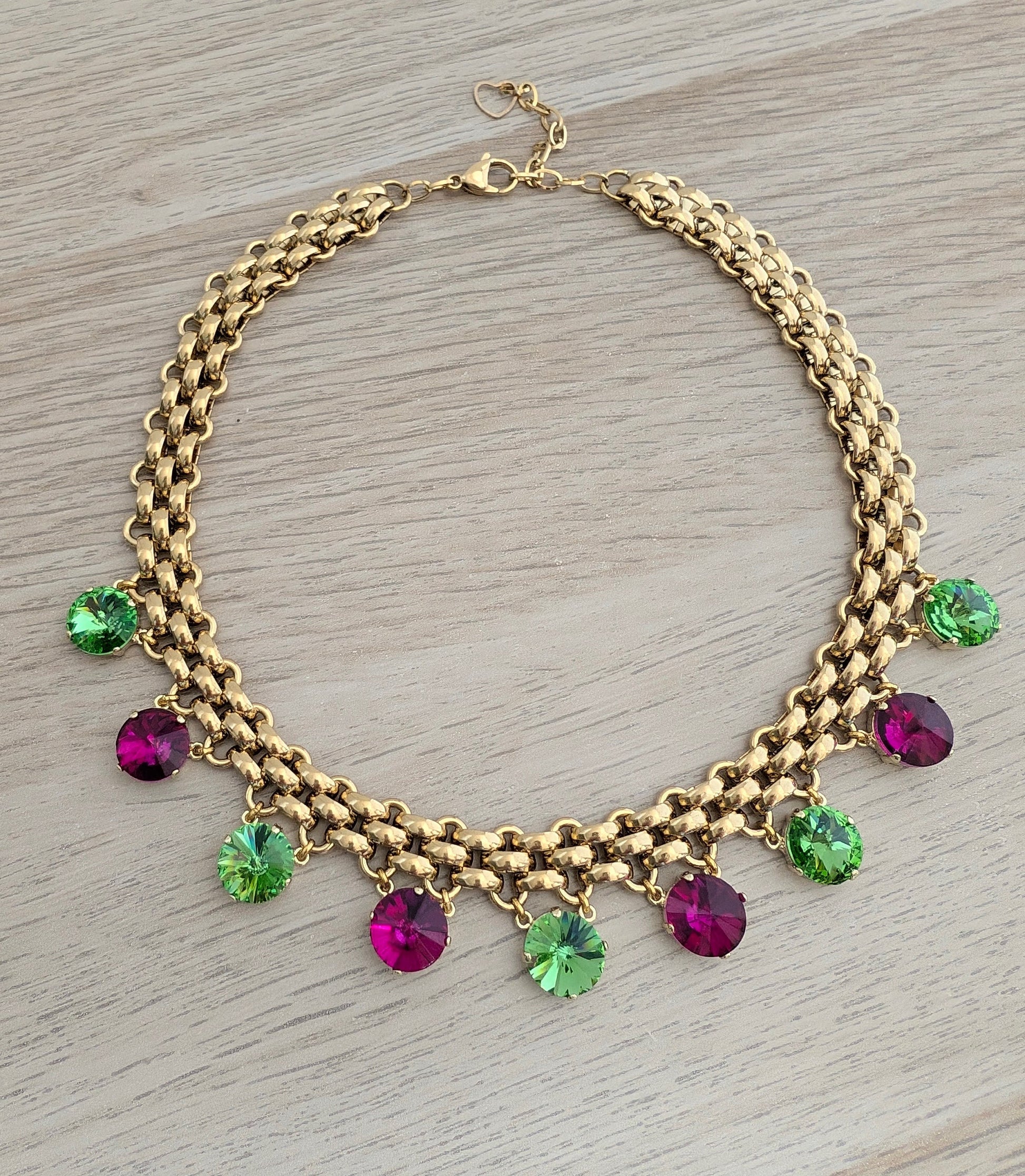Elevate your boho-chic style with this stunning chunky gold chain necklace featuring 9 breathtaking pendant charms in peridot green and fuchsia pink. This unique boho piece effortlessly combines modern trends with a touch of vintage charm, making it the perfect accessory for any occasion. It can be worn by itself, or layered with existing jewellery pieces for fashion statement. Stand out from the crowd and add a touch of elegance to your look with this one-of-a-kind necklace set that radiates sophistication and style. Perfect for gifting or treating yourself to a little luxury.