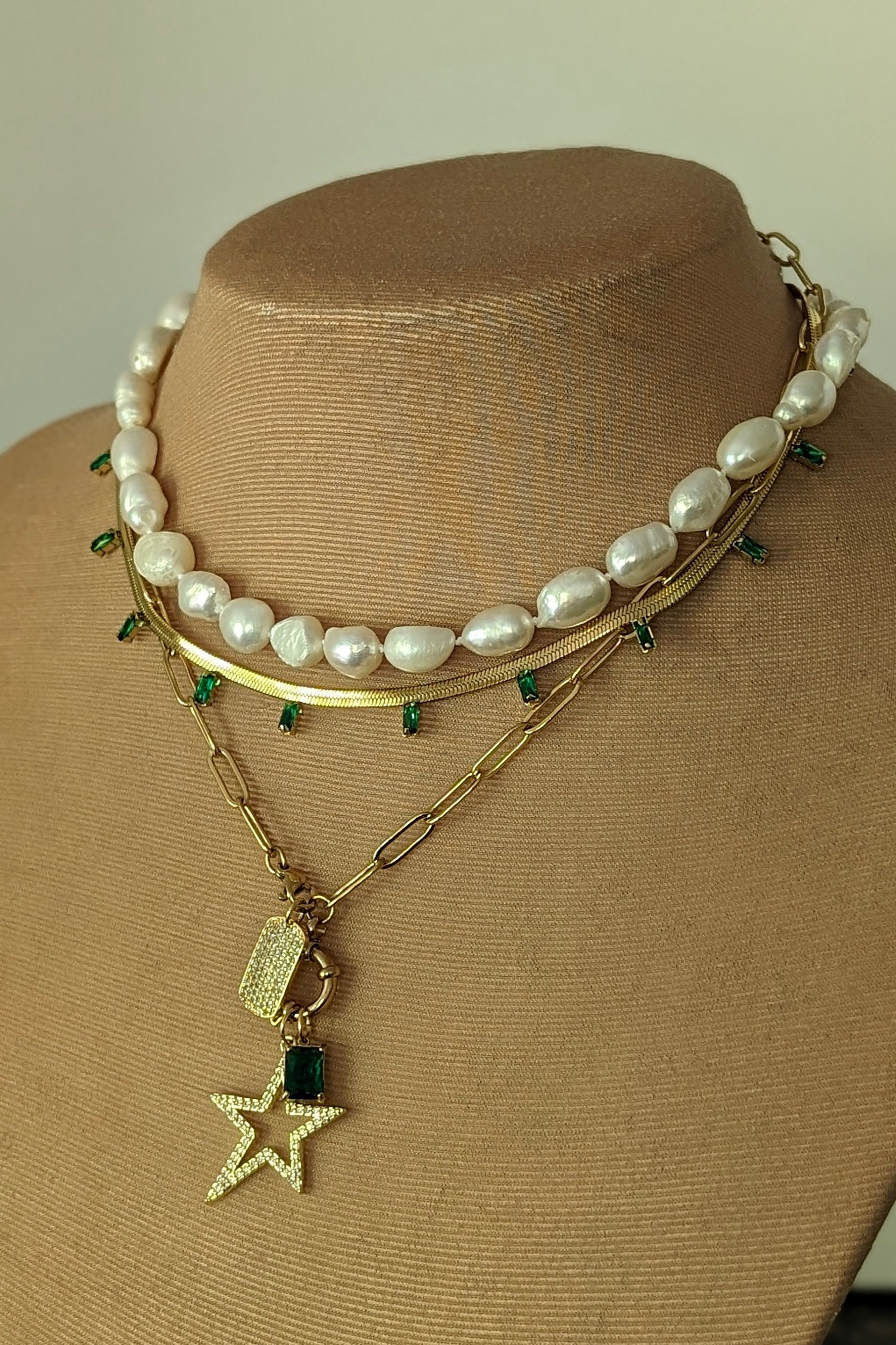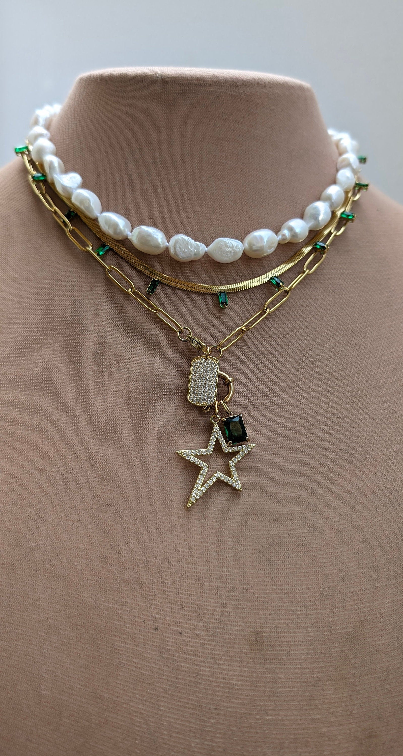 The top layer herringbone necklace has emerald baguette crystals placed all around, forming an edgy, modern look. Paper clip chain has a large spring clasp, holding a pave tog tag, a pave star and an emerald baguette charm. It is very modern and trendy.