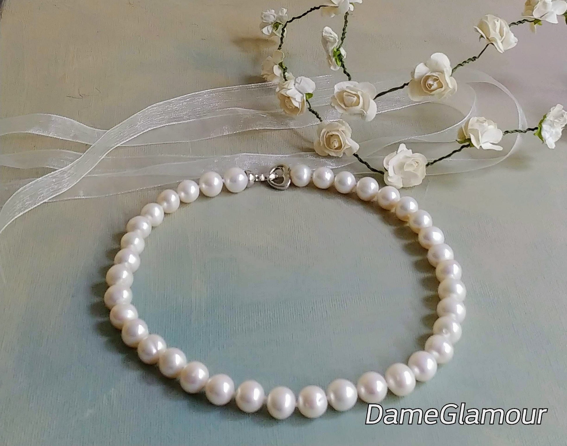This is a beautiful hand knotted pearl necklace, made with 10-11mm size genuine freshwater pearls, ending with a 925 silver, heart shaped fold over clasp. It is simple and elegant.