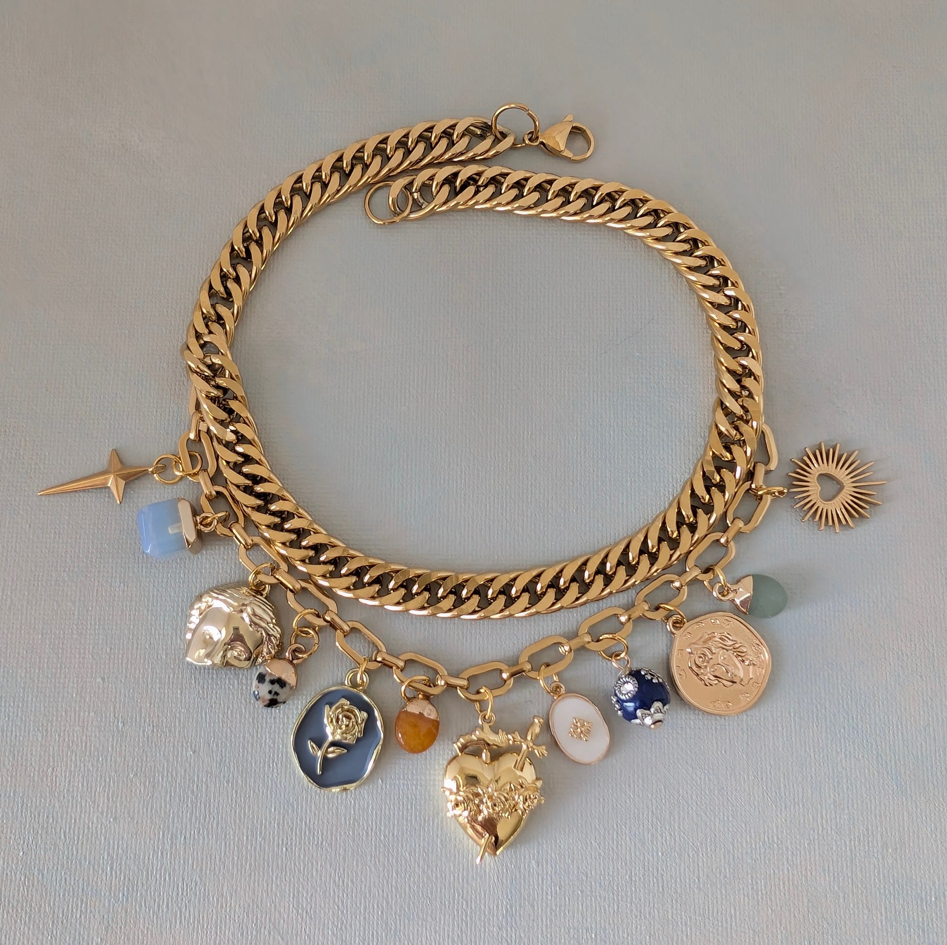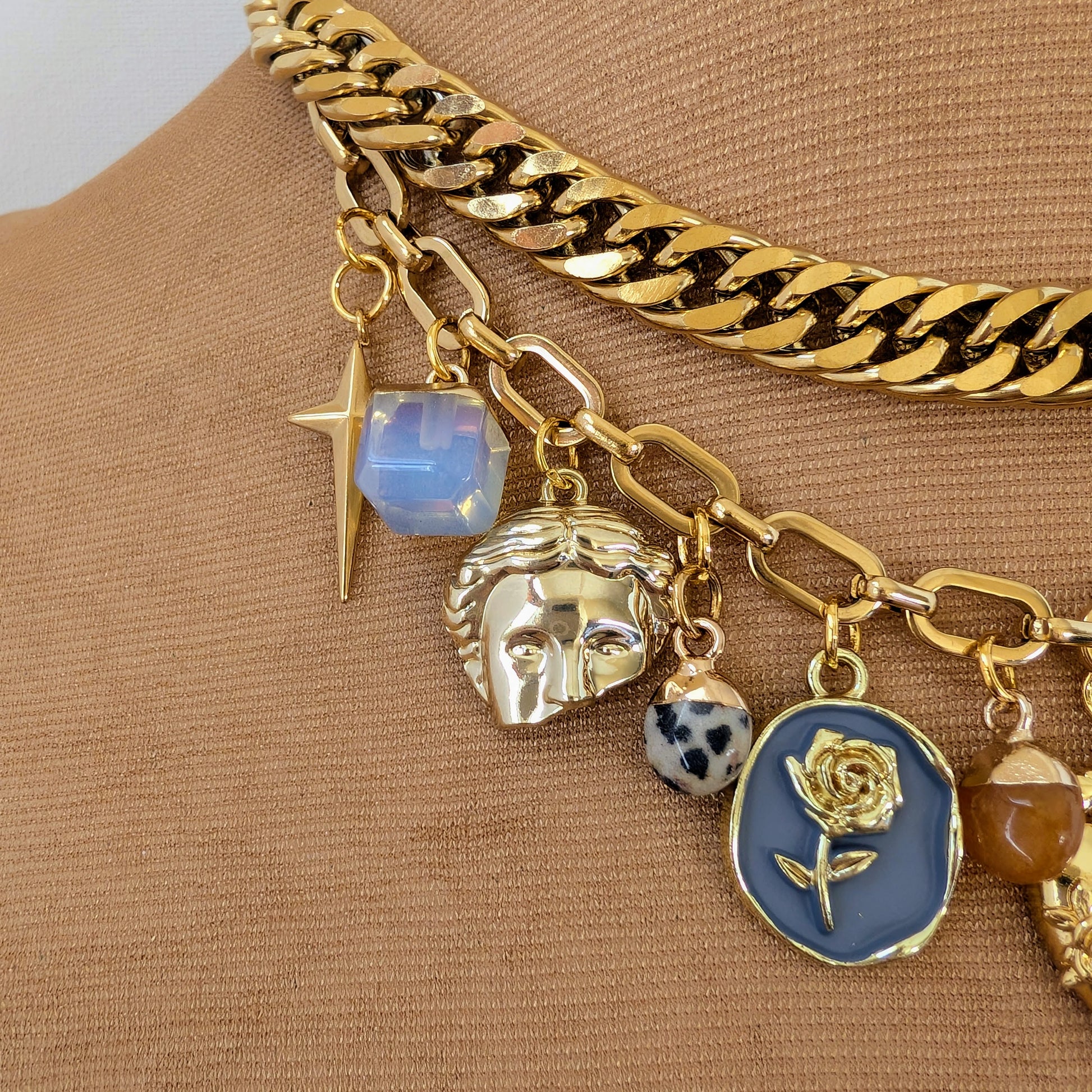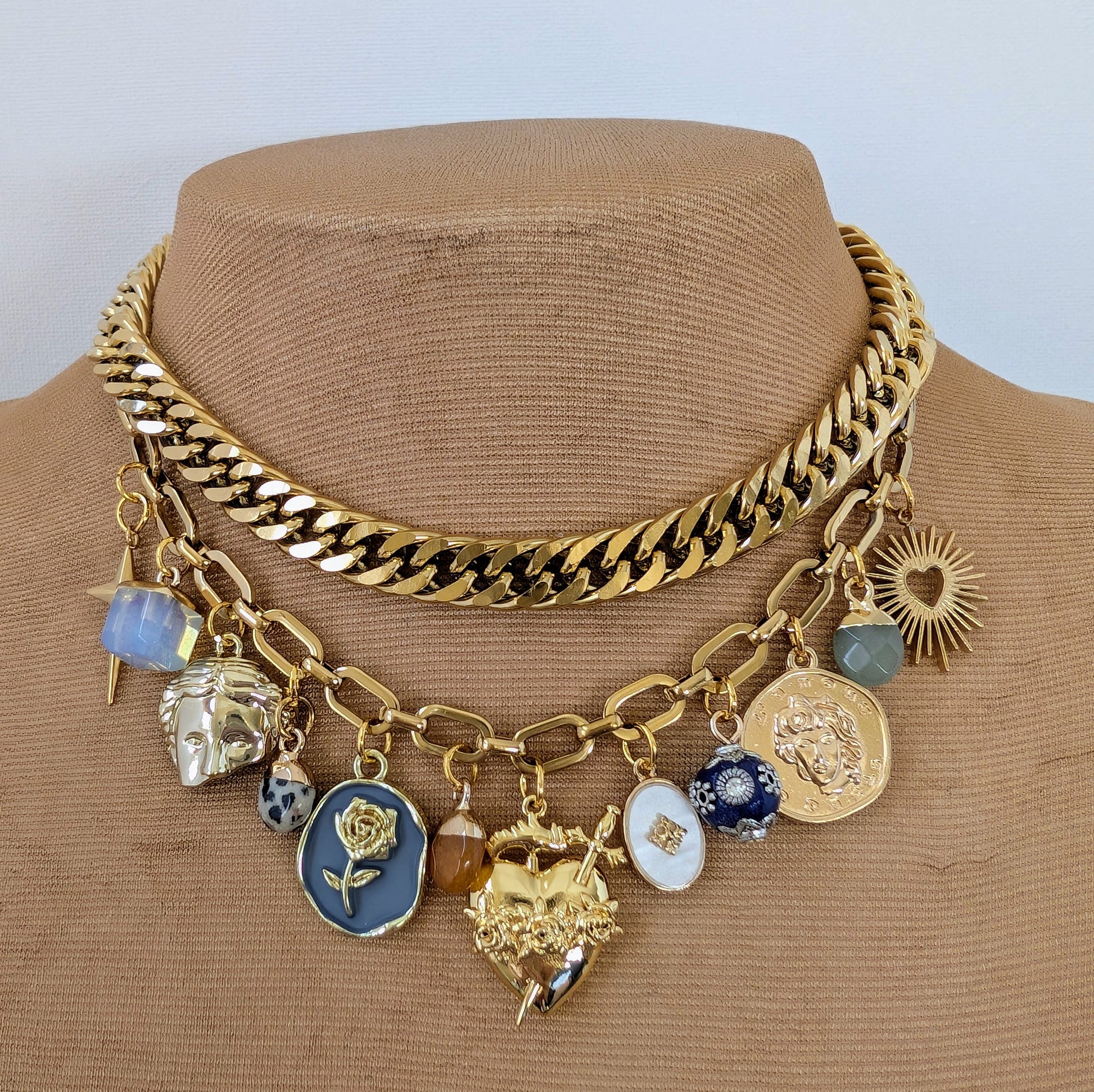Elevate your style with this stunning and elegant two layer multi charm necklace. This unique and trendy piece effortlessly combines modern trends with a touch of vintage charm, making it the perfect accessory for any occasion.