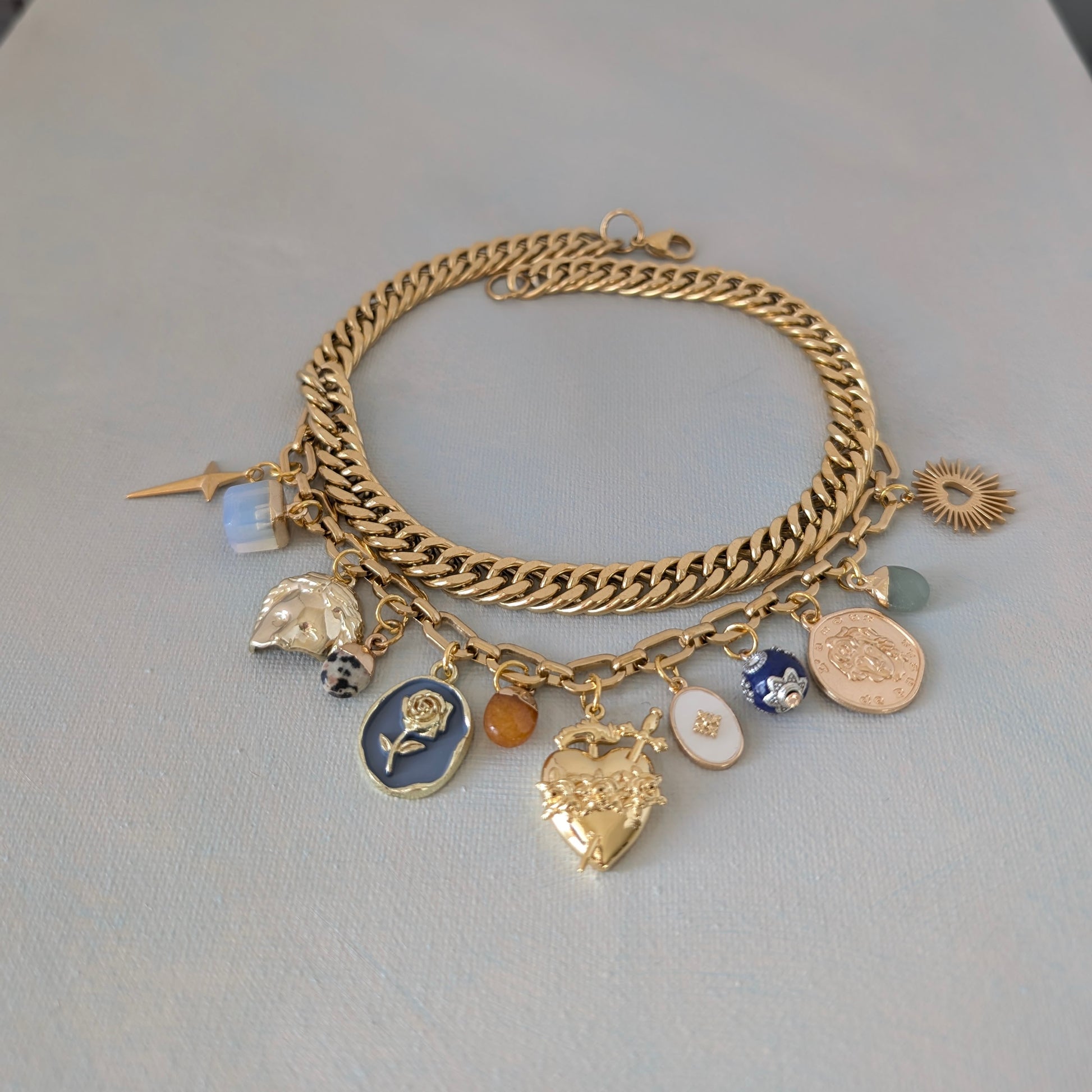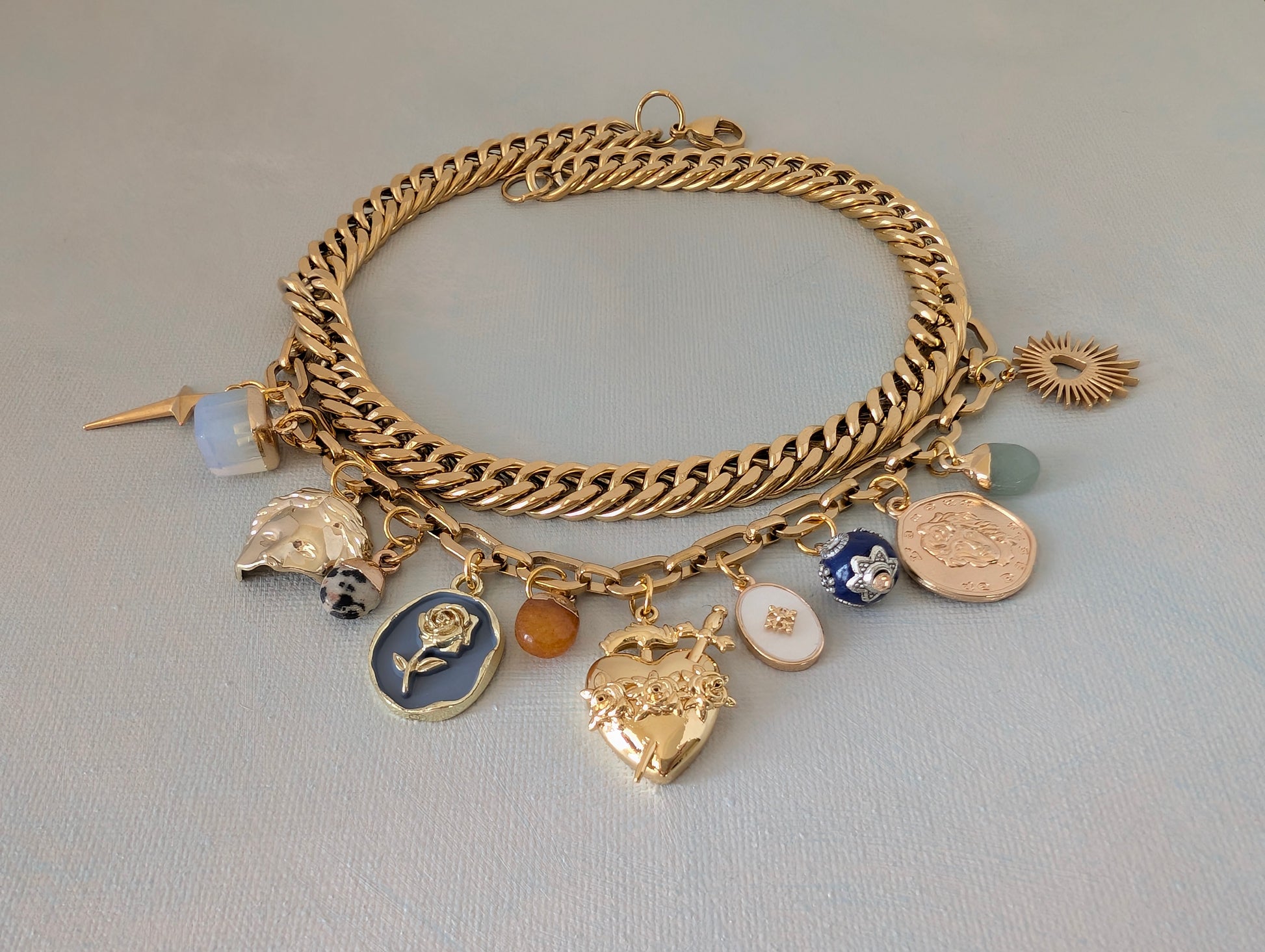 Materials: 14k gold-plated brass heart, antique mask, coin, enamel floral medallioin, mother of pearl charm, decorated bead, chalcedony cube.