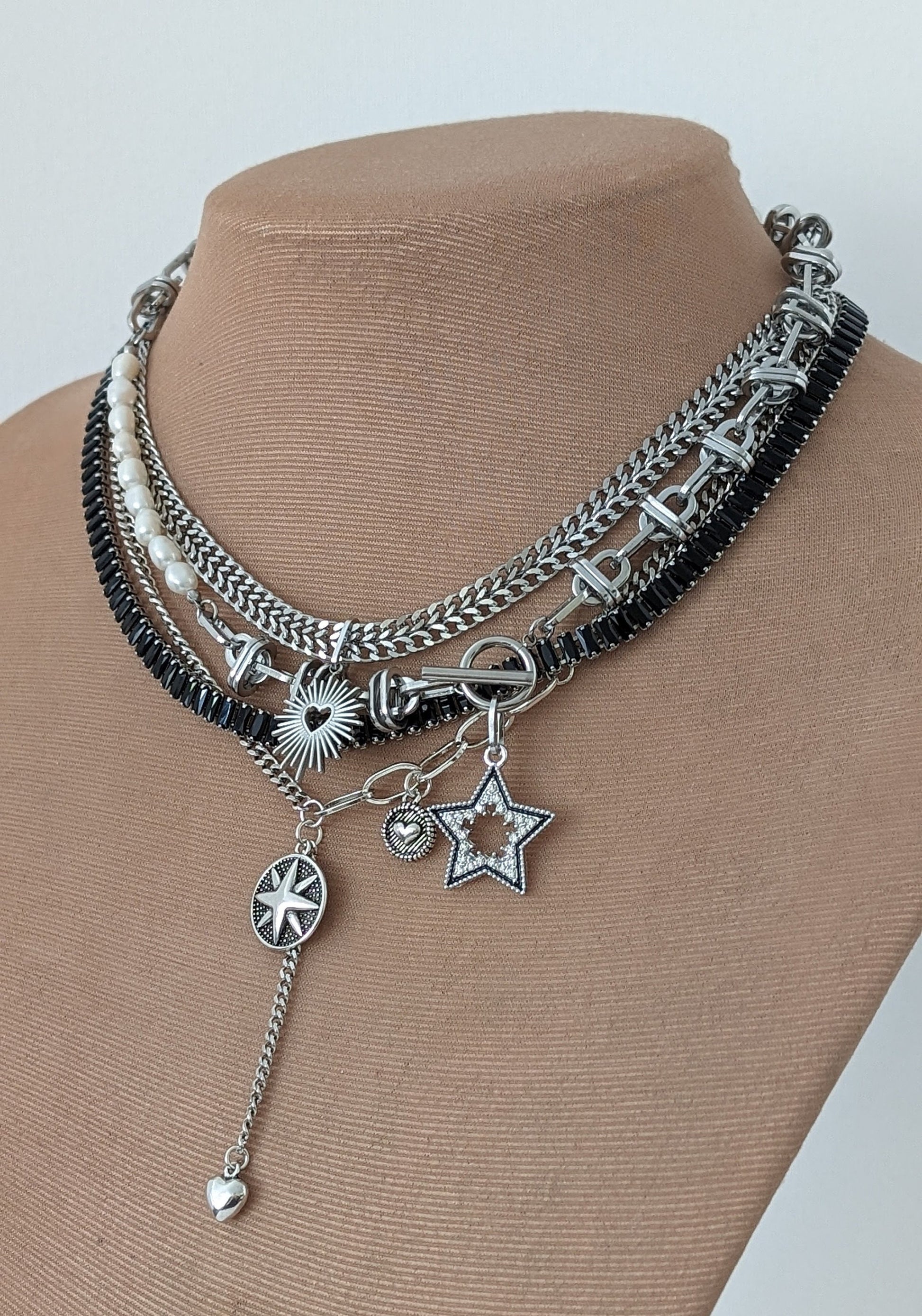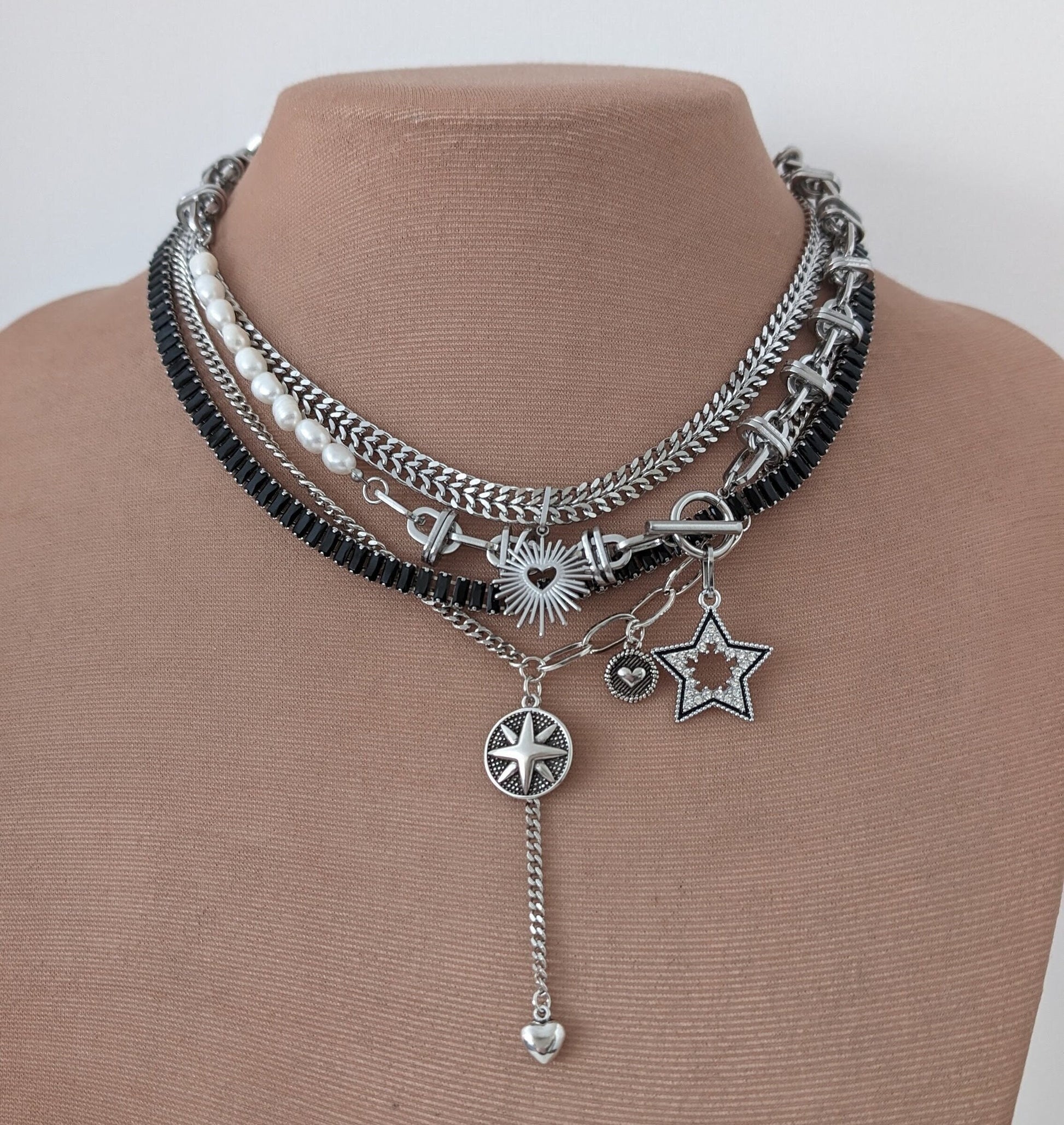 This is a set of 4 necklaces in silver and stainless steel. The combination is very modern and chic. The layers create a boho set, each with its own pendant. The heart pendant hangs on stainless steel double curb chain. The spiky design makes this a modern and edgy piece of jewelry. The group is accentuated with a black onyx crystal baguette cut necklace. It has an extension piece in the same style as the necklace.