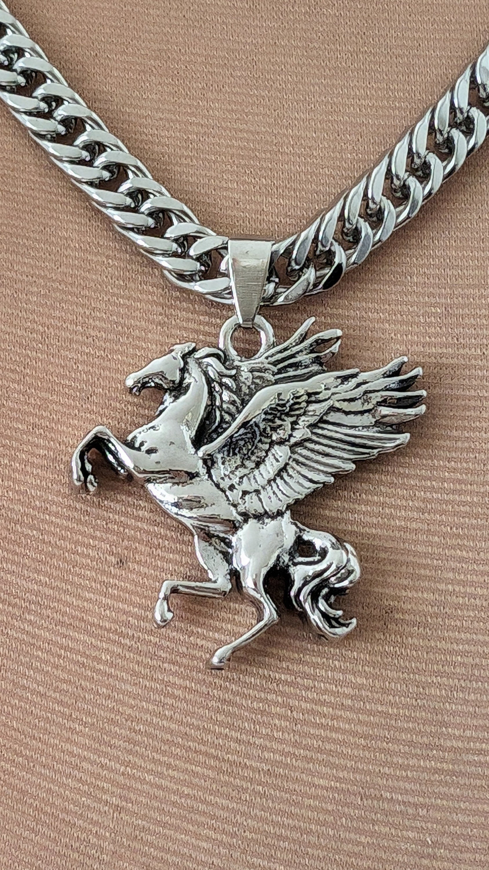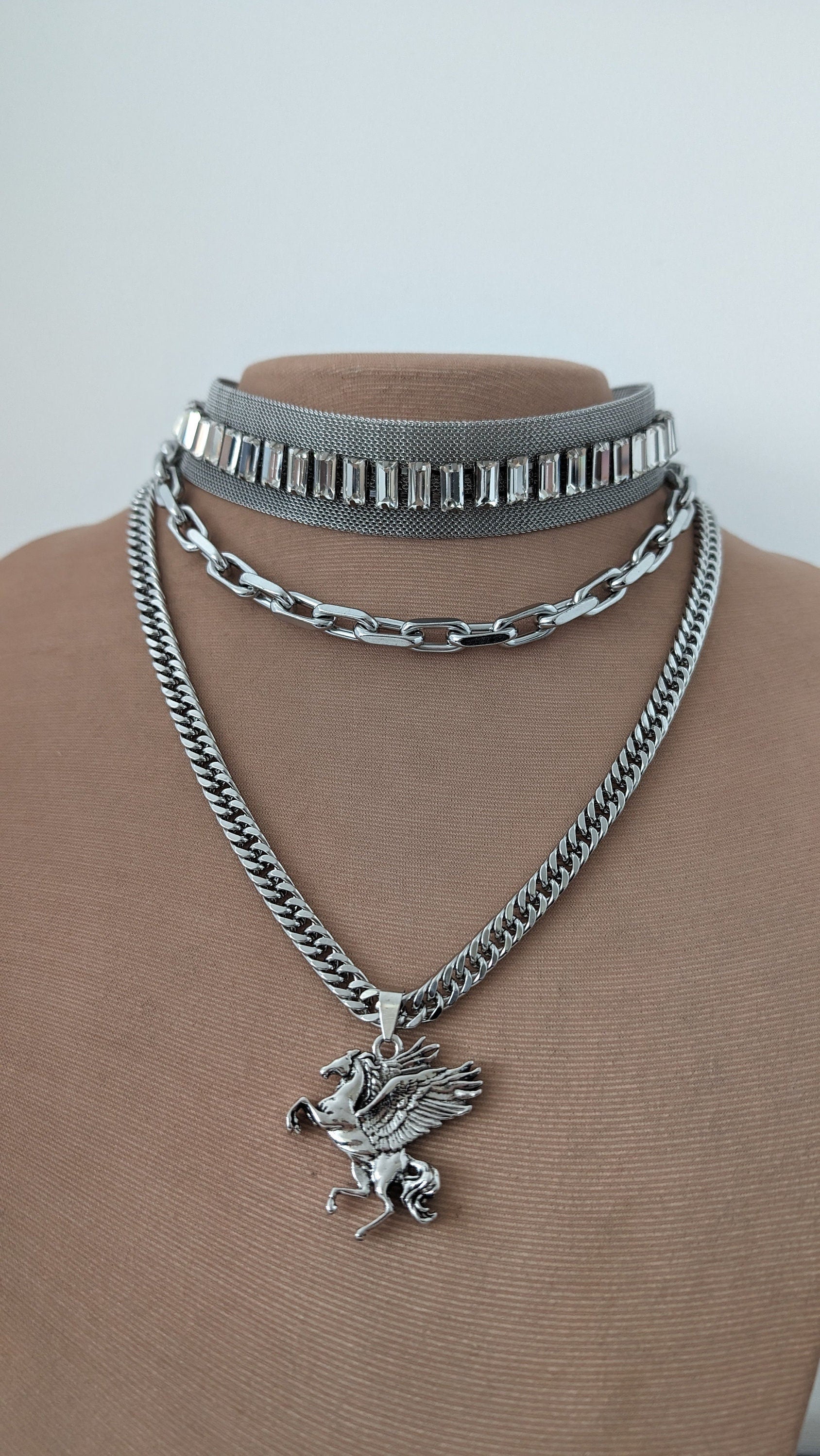 The third necklace is made with double curb chain which has an equine (horse) pendant, perfectly matching the chunky look of the overall set.