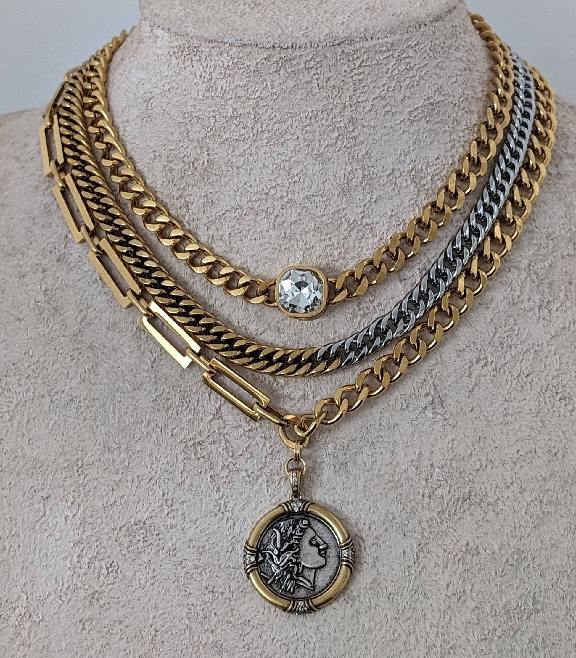 Layered gold chain necklace set, chunky multi layer necklace, ancient medallion pendant, two tone chain necklace, curb chain diamond choker