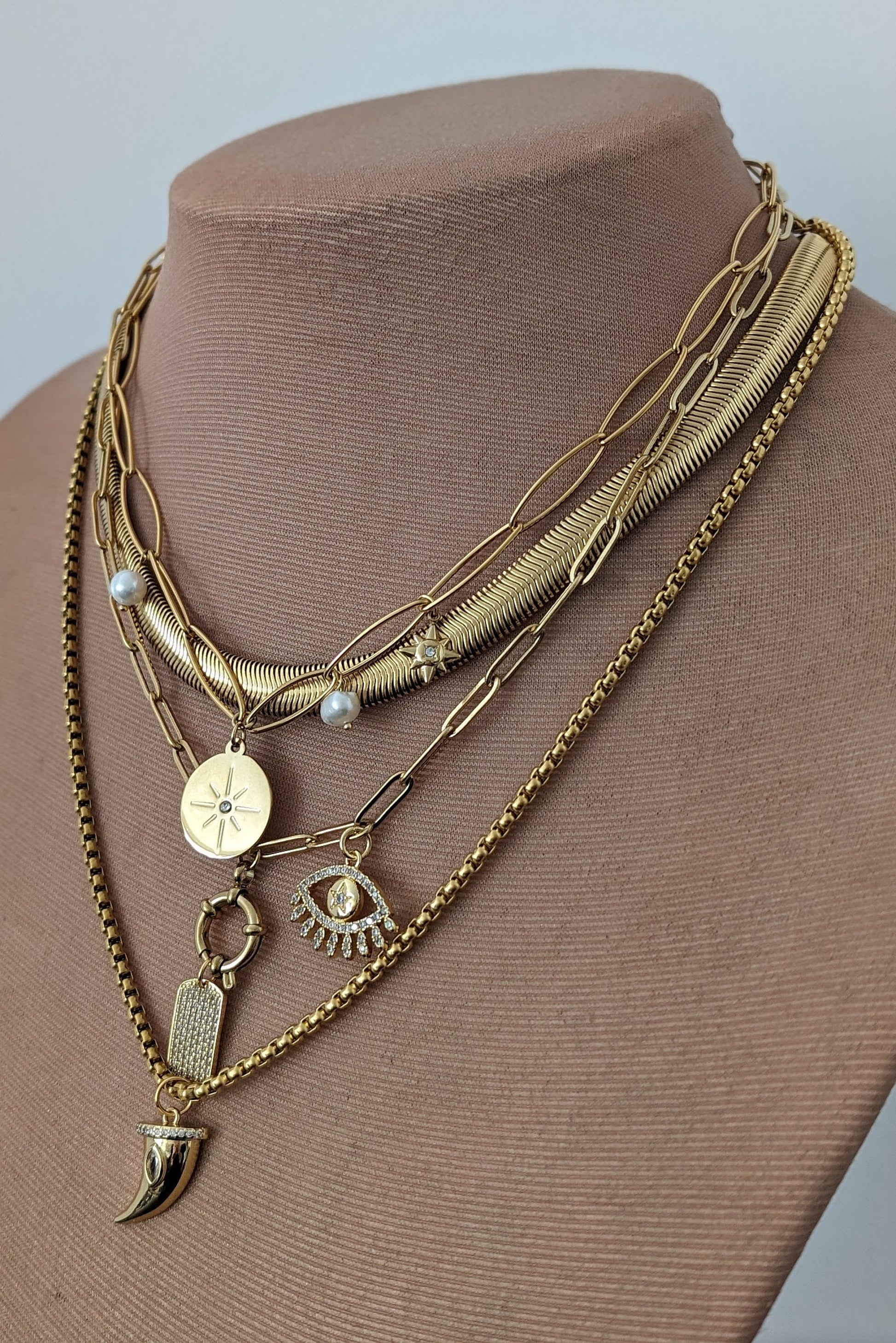 Layered mixed chain necklace, gold multi layer necklace set, boho dog tag necklace, evil eye non tarnish jewelry, box chain horn pendant