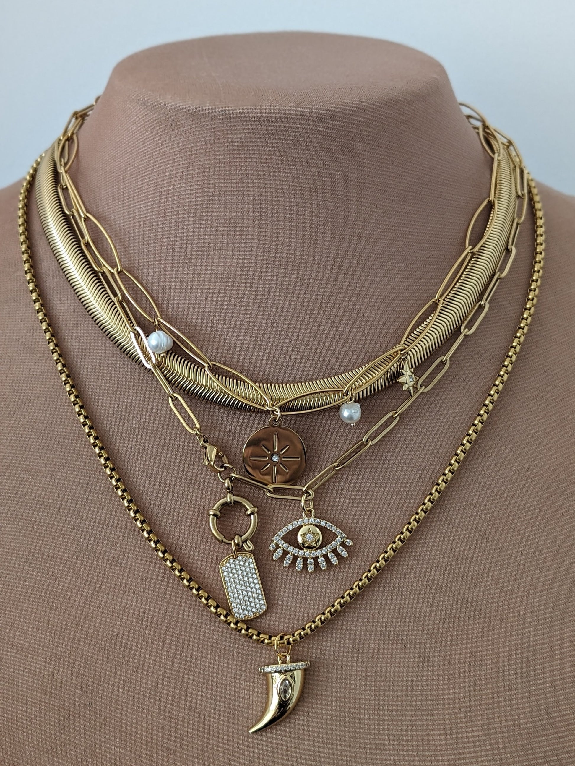 The necklaces each have their own clasp for versatility. The paperclip chains have evil eye, dog tag, north star, small star, and feshwater pearl pendands. Box chain necklace also has a horn pendant, adorned with zircon crystals. Herring bone necklace is gorgeous by itself, being thick and impressive.