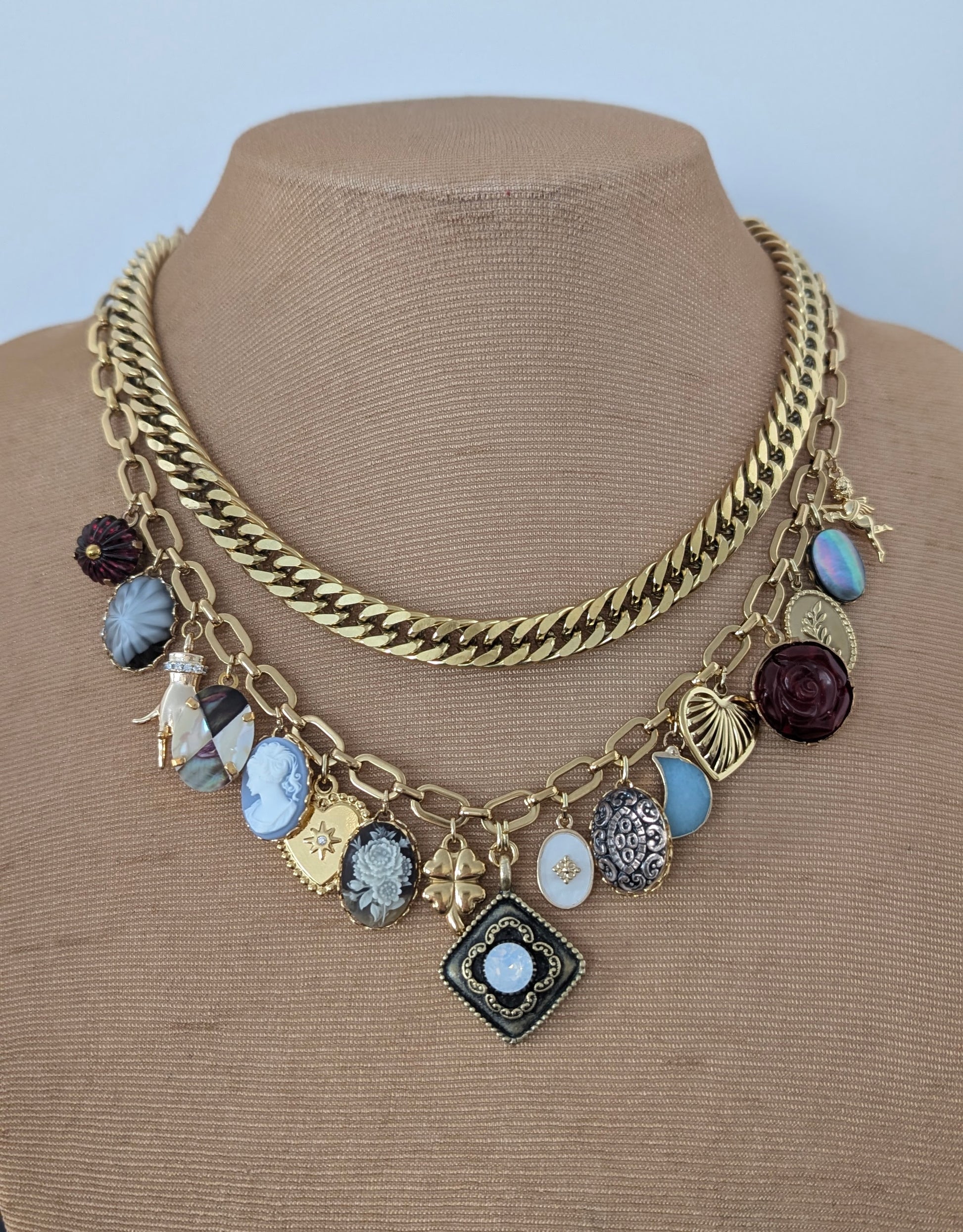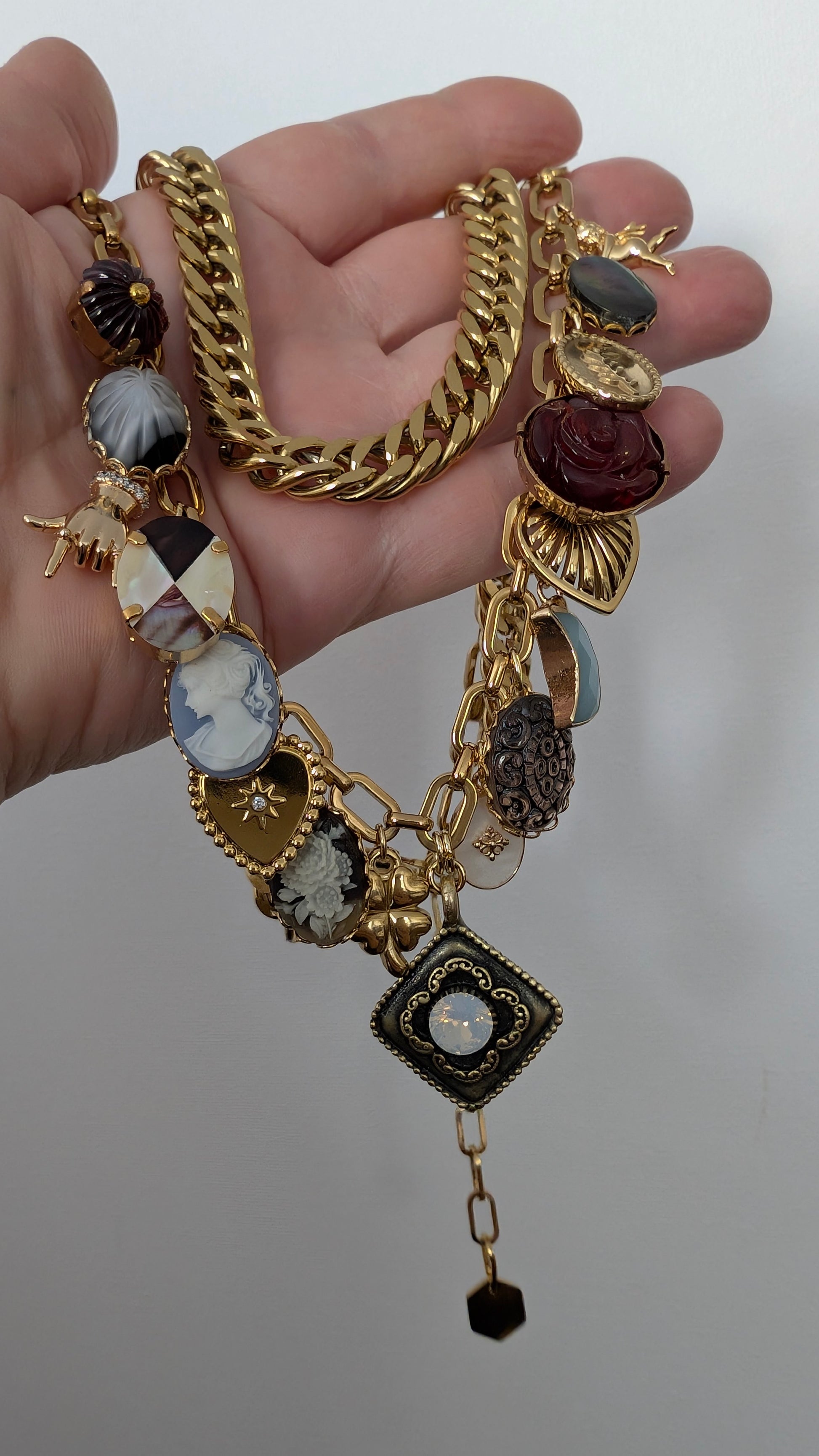 Materials: 14k gold-plated brass , enamel, mother of pearl, abalone, vintage cameo, vintage glass, stainless steel.