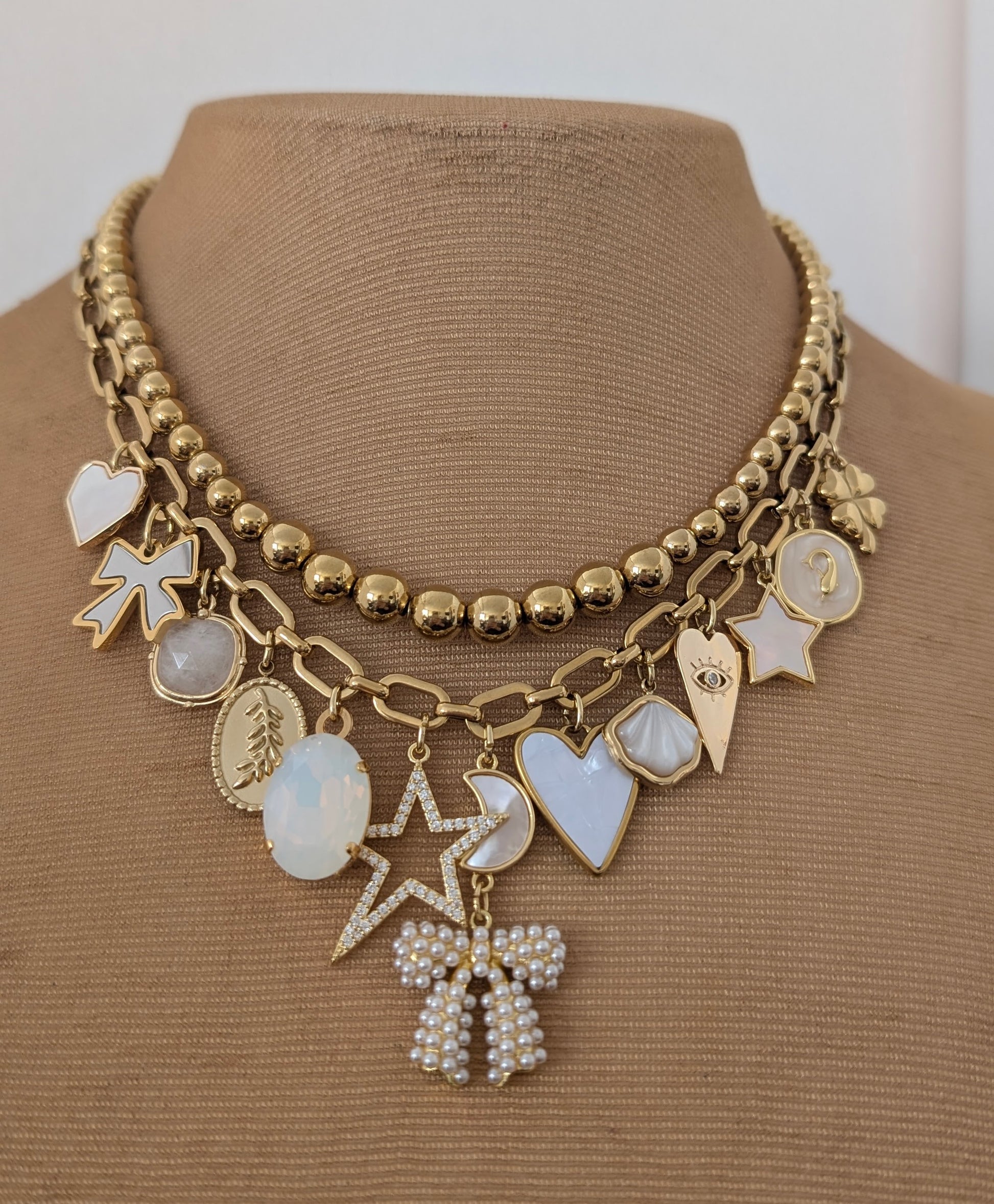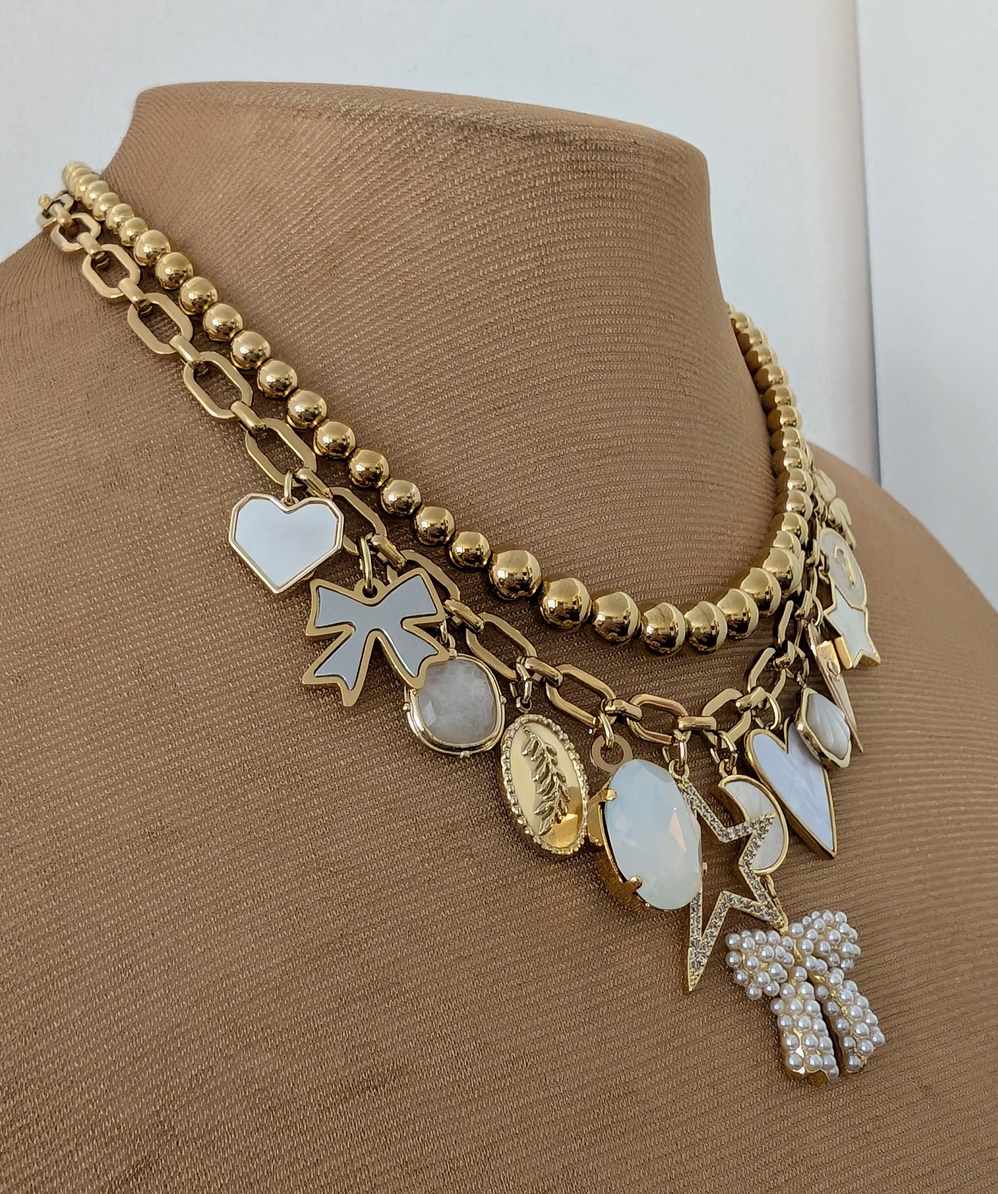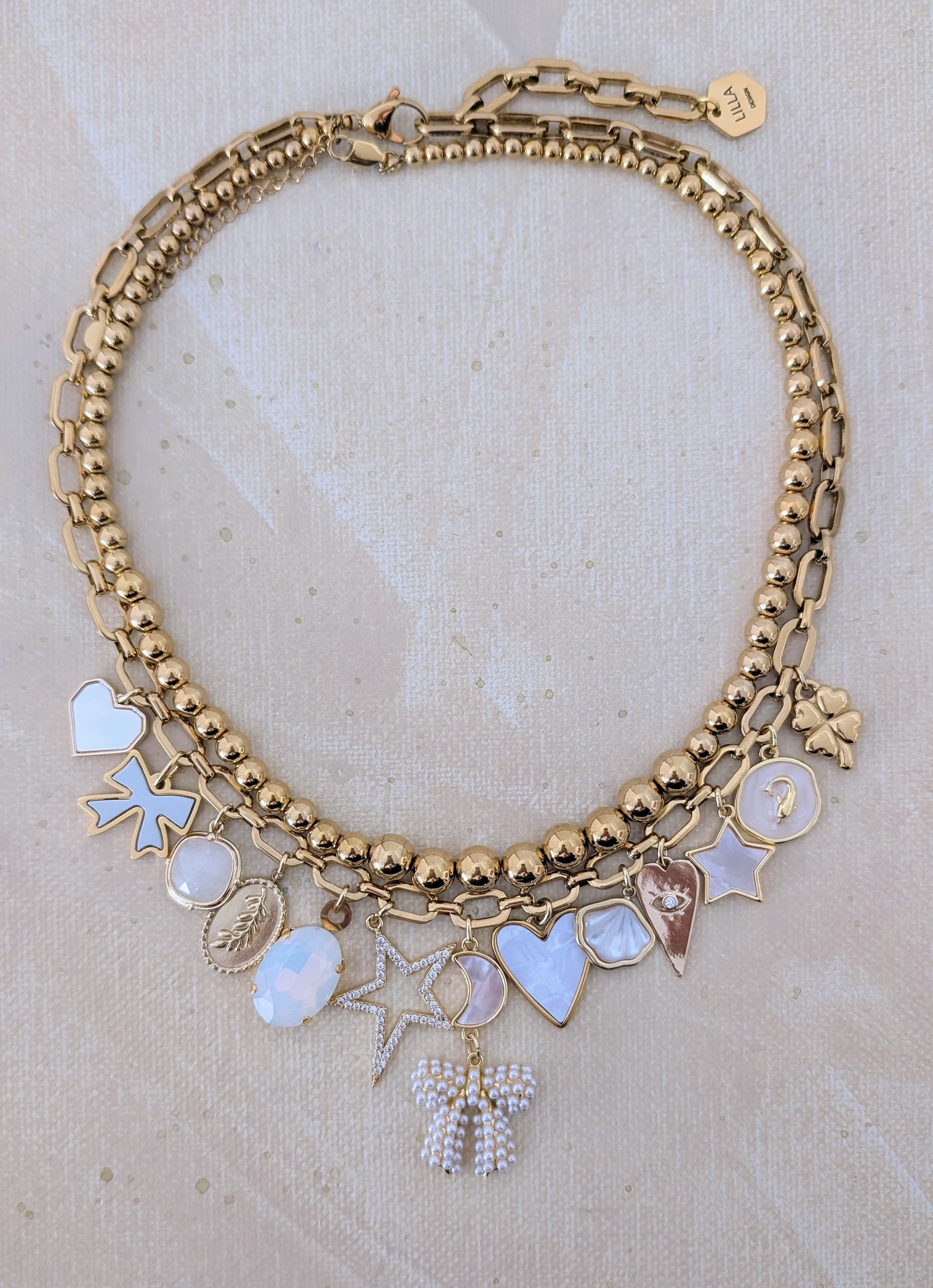 The set combines a graduated beaded stainless steel necklace and a link chain necklace with white themed charms. There are a total of 14 beautiful charms combined to make a bespoke necklace.
