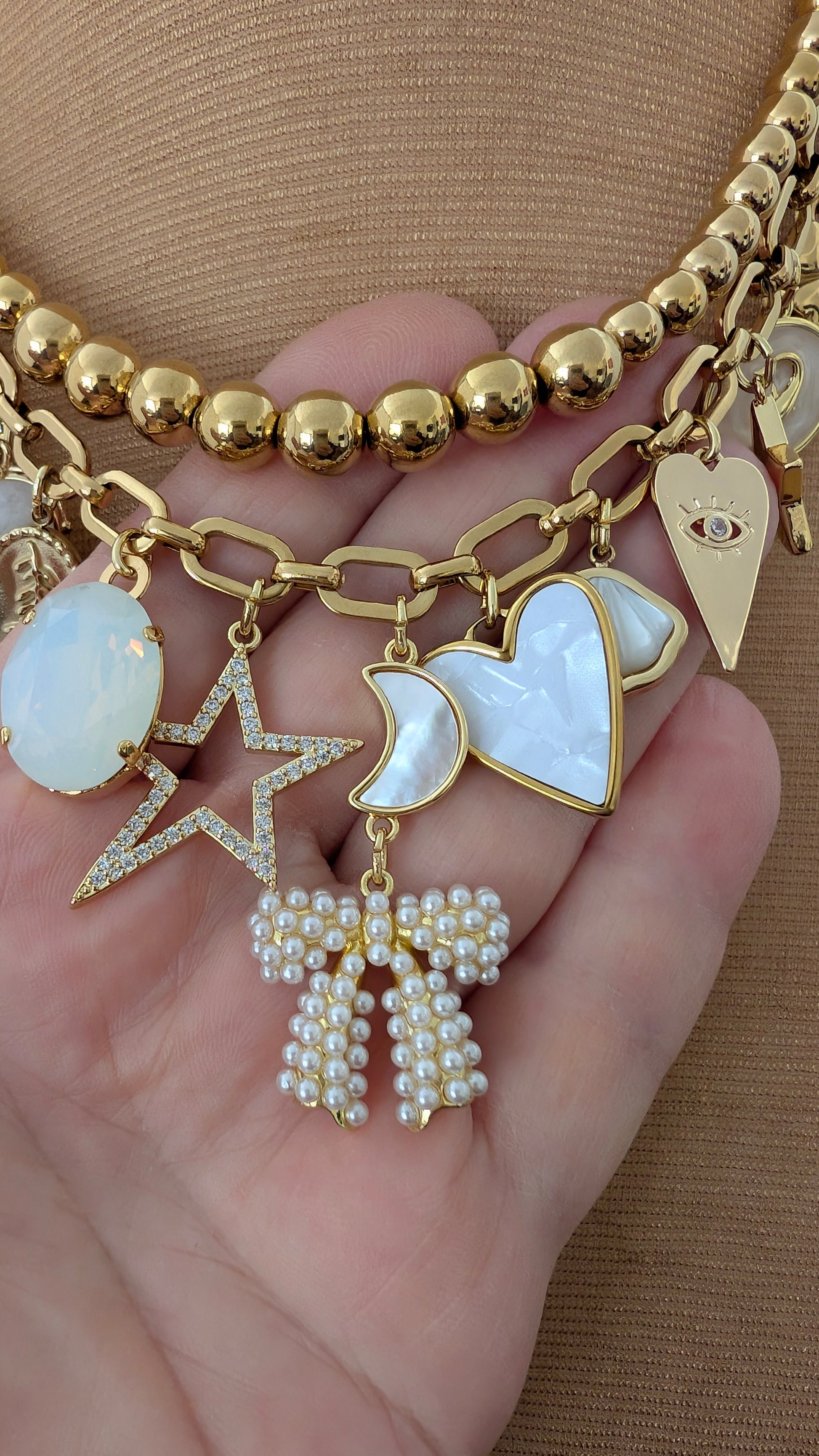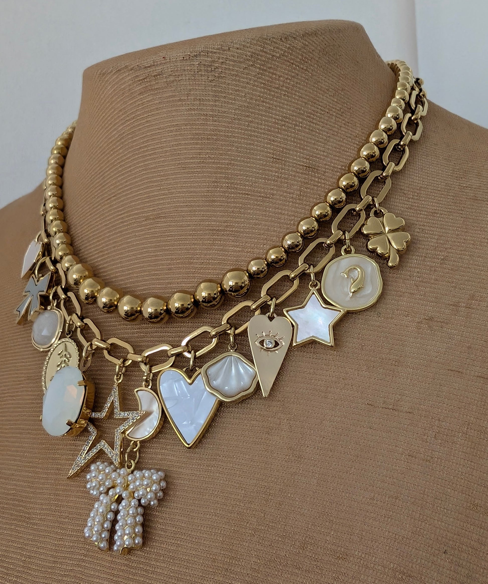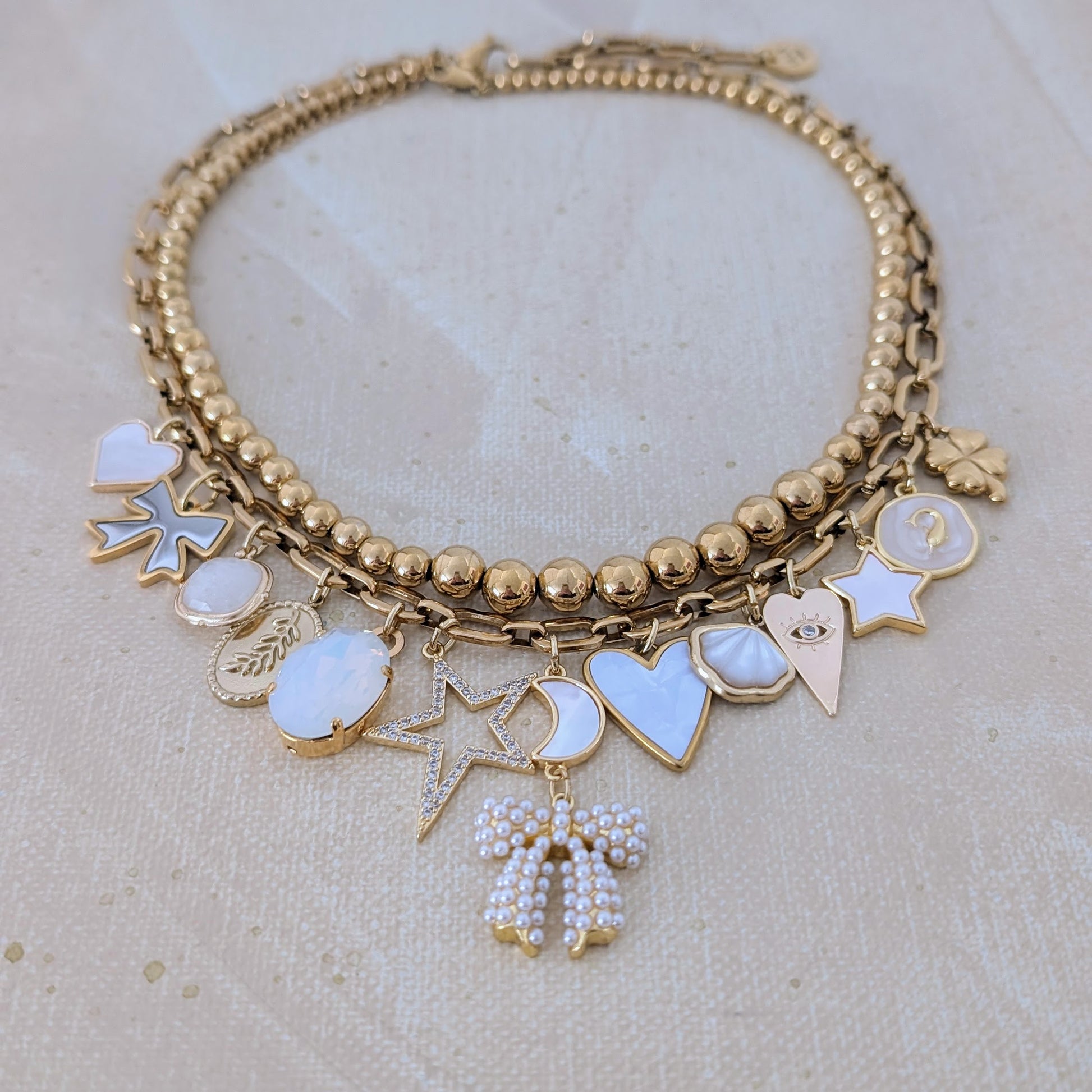 The set combines a graduated beaded stainless steel necklace and a link chain necklace with white themed charms. There are a total of 14 beautiful charms combined to make a bespoke necklace.