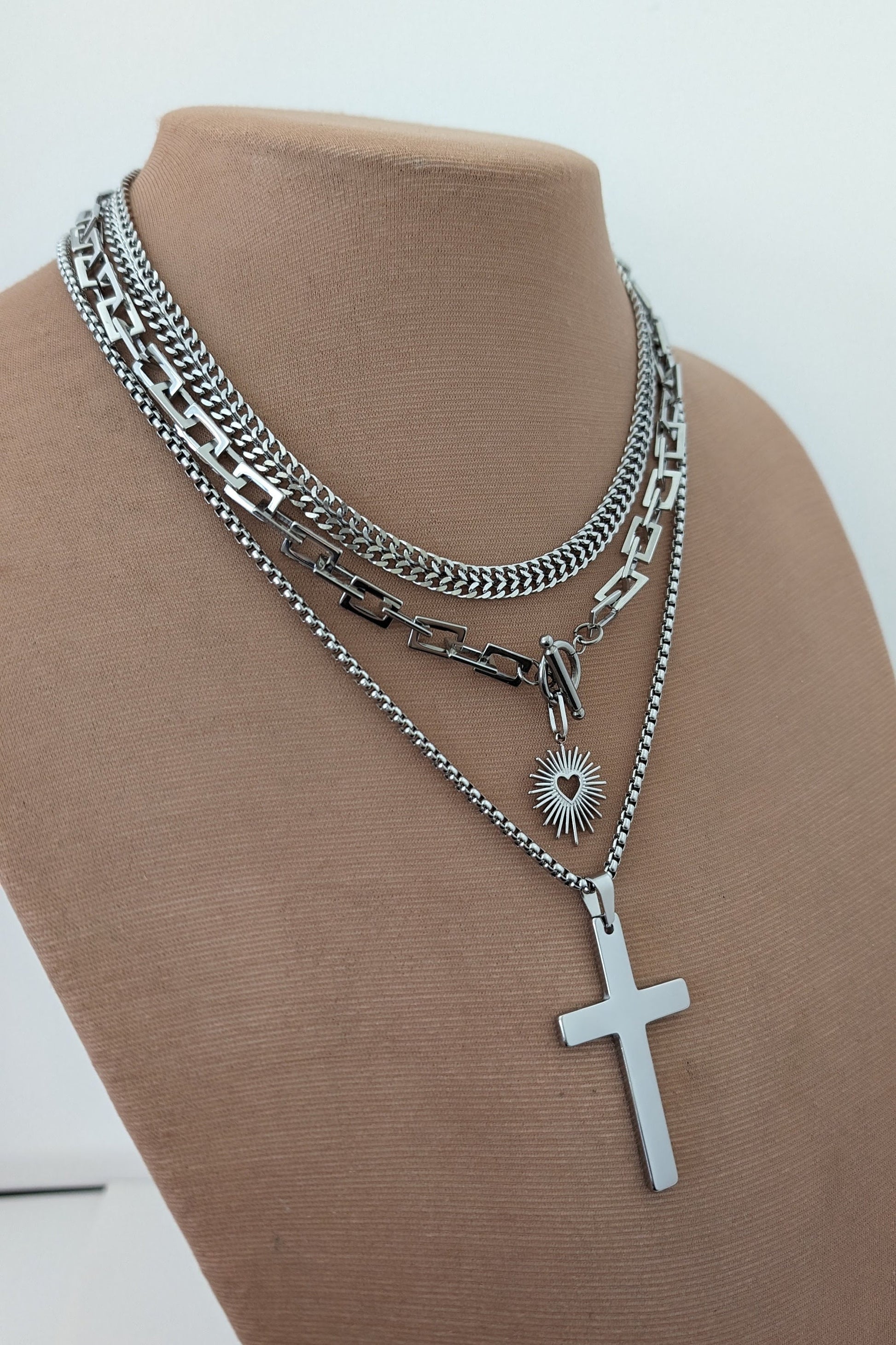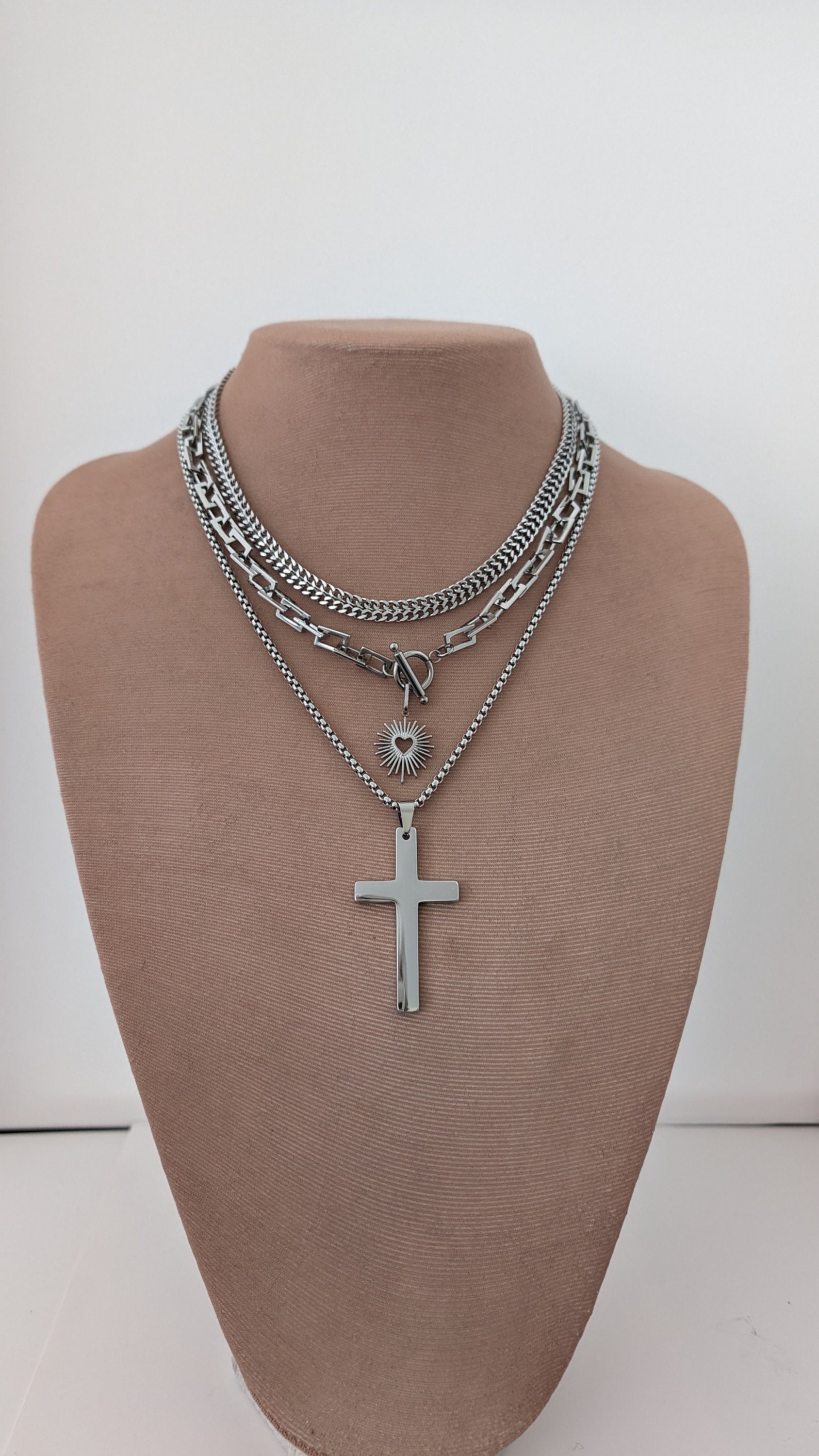 The modern and stylish stainless steel cross hangs on a long box chain, creates a vertical focal point. The shortest layer is an intricate chain, a statement piece all by itself.