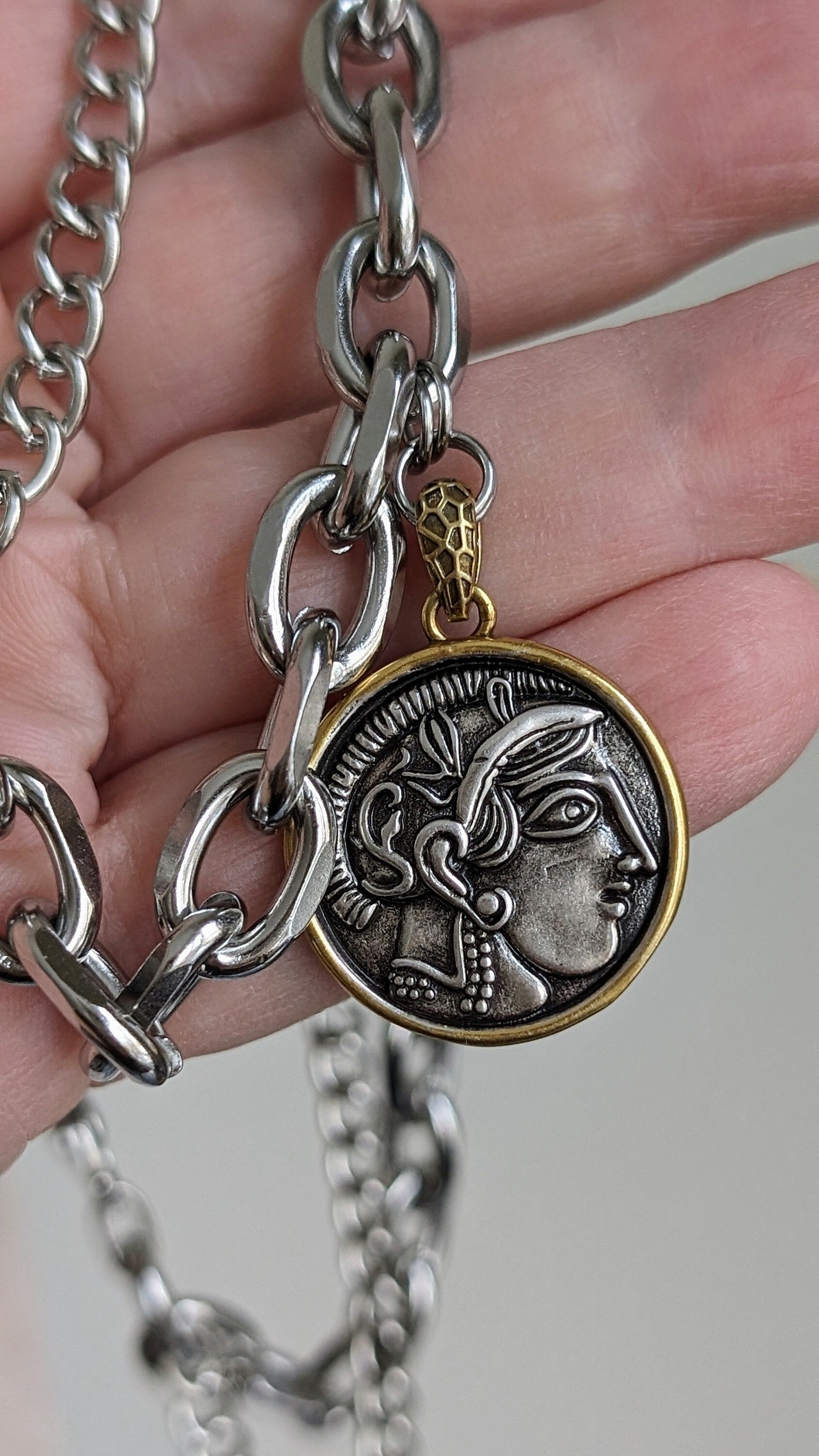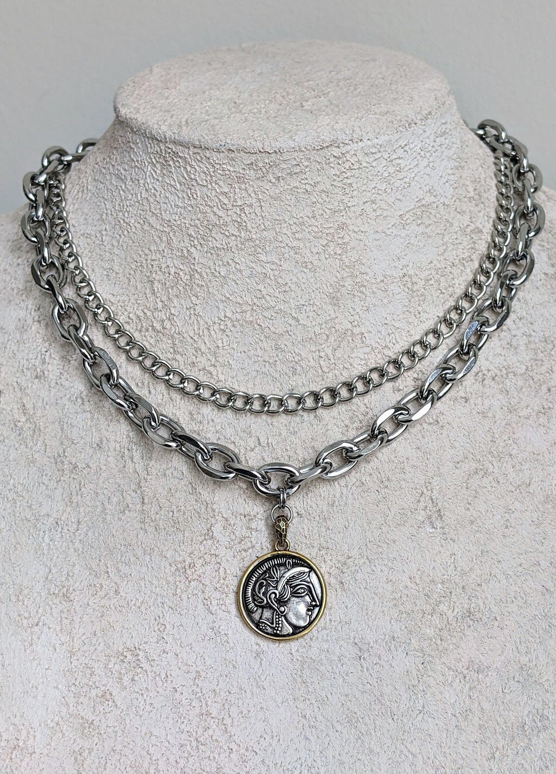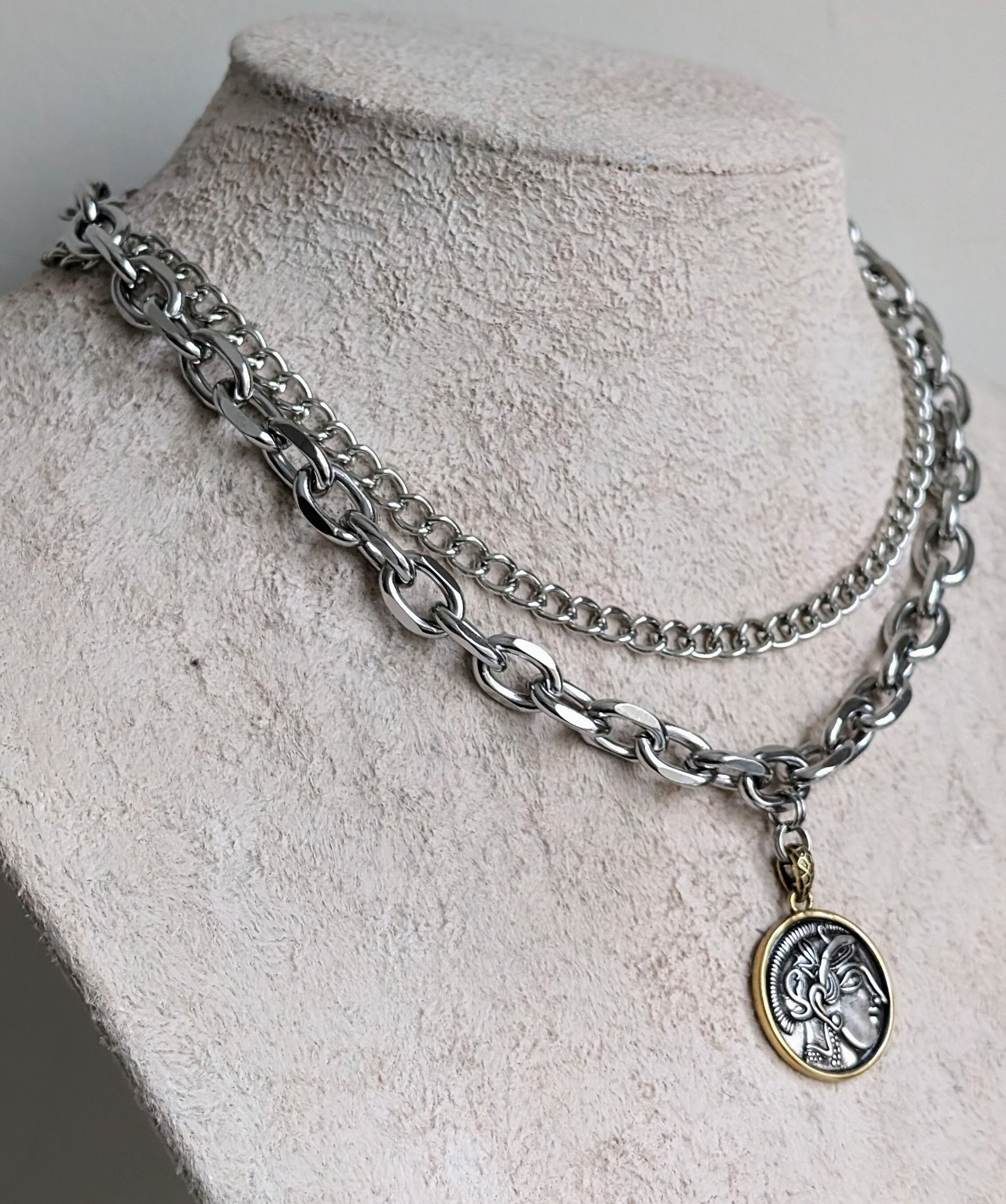 Stainless steel coin necklace set, double layer necklace, cuban curb chain choker, chunky silver chain, boho necklace, non tarnish choker